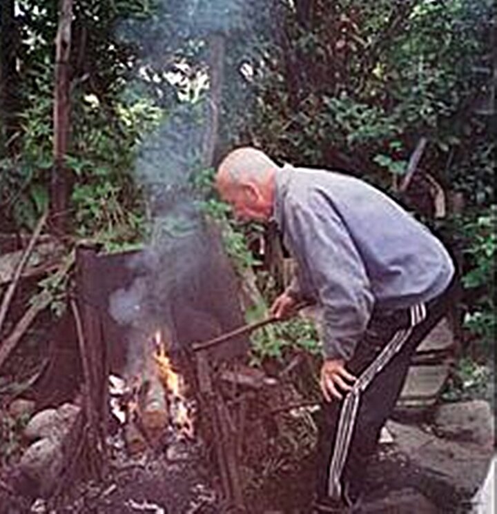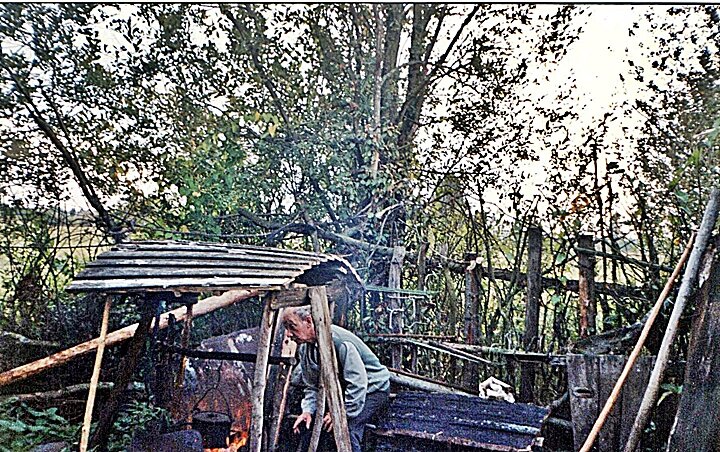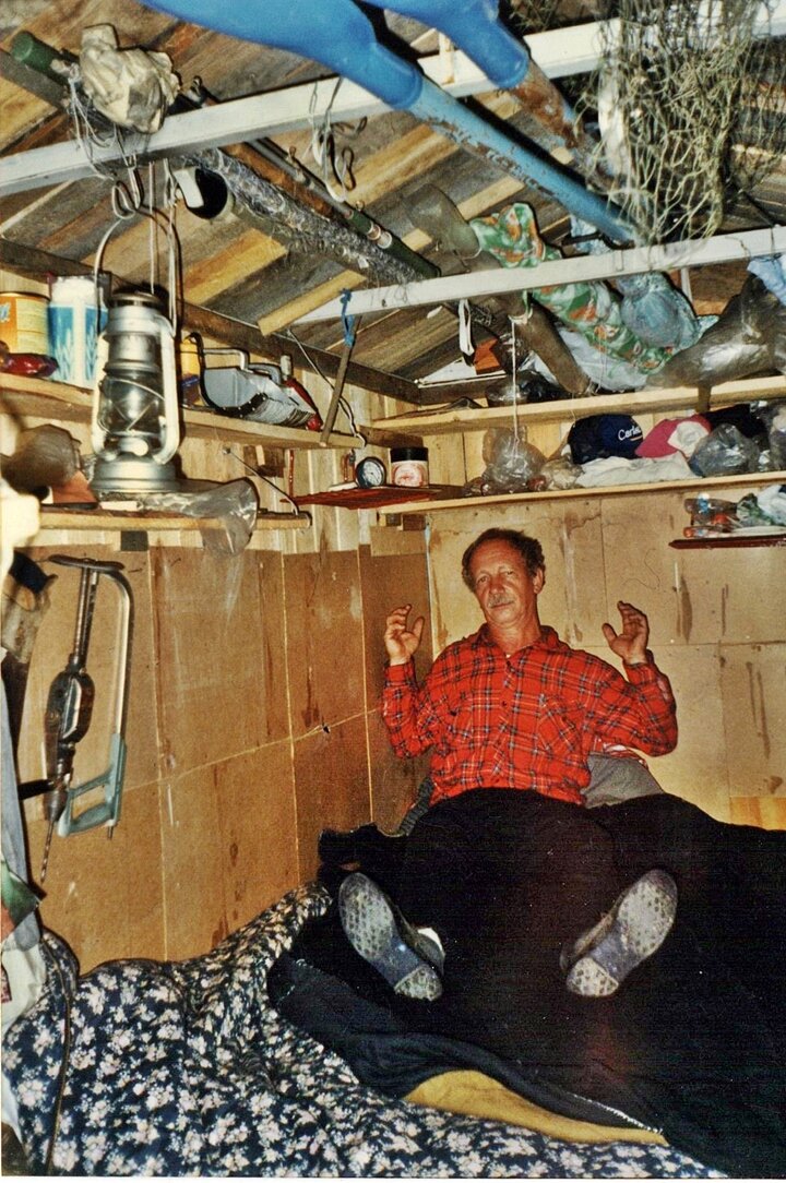 Первое время обходился простейшей защитой от дождя, готовил еду на костре. Привёз из