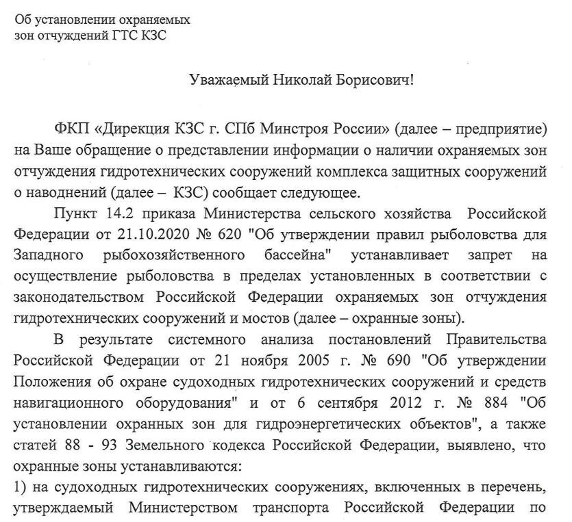 Подробно же, что б у читателей было понимание корня путаницы, дело обстоит так: правила рыболовства действительно запрещают лов в охранных зонах гидротехнических сооружений, но только в тех, которые установлены в законном порядке. А законный порядок это установка официально такой зоны правительством Российской Федерации. Впрочем, приведу ответ от дирекции КЗС