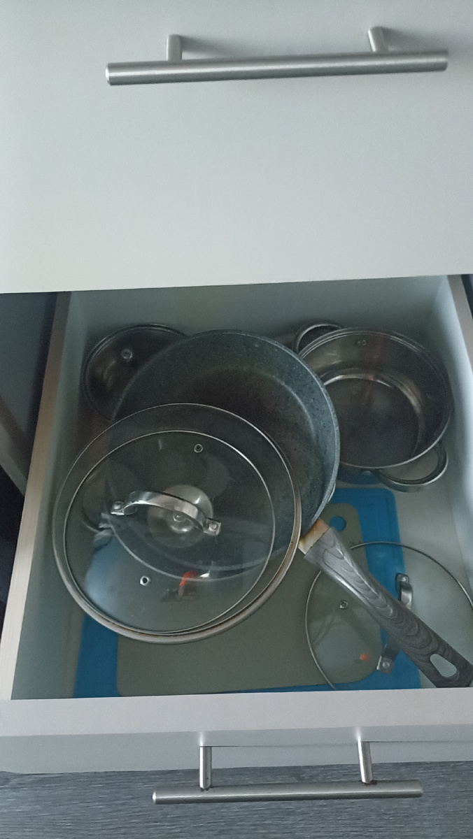 Из техники: индукционная плита, микроволновка, чайник, холодильник, телевизор. Посуда для плиты (пара кастрюль, сковорода), тарелки, кружки, столовые приборы.