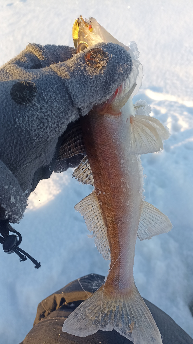 Выстрелил Killer. А мороз стоит такой, что блесна из трехгранки постепенно превращается в овальную за счет намерзания льда.