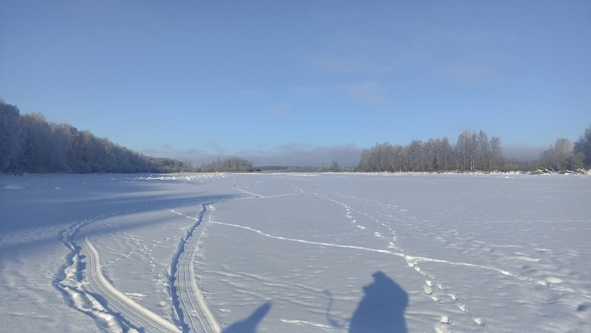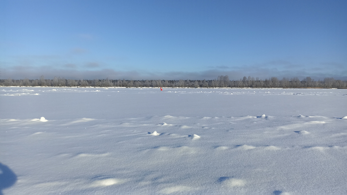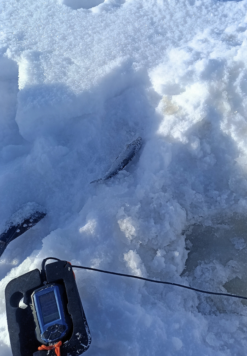 У Сергея тоже поклевки, но неудачные. У меня идут легкие подбивы снизу. Снова жалею, что не взял мормышки. Но чего уж. Решаю скомпенсировать скоростью перемещения, и увы, чем дальше от места впадения речки, тем хуже. А тут еще время обеда настает. Пора на базу.