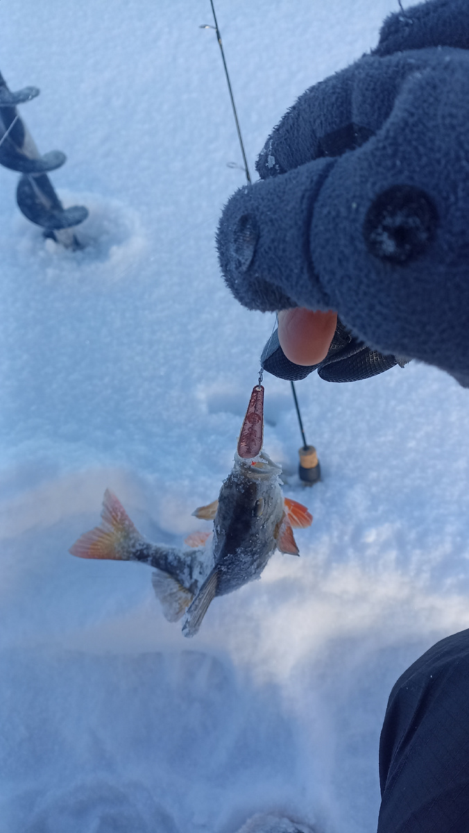 Откладываю блесну, берусь за мормышку, благо тяжелая мормышка в арсенале есть. И уже через пару минут первая рыбка на льду.