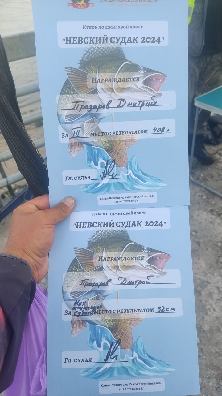 кнб Опубликовано: 25 августа 2024 Жалоба Опубликовано: 25 августа 2024 Итоги Кубка "Максимуса" "Невский судак 2024" Первое место и кубок "Невский судак 2024" - Дмитрий Шеенко Второе место - Фенин Александр Третье место - Дмитрий Прозоров Номинация "За максимальное количество отпущенных судаков" - Дмитрий Прозоров Соревнования внезапно оказались достаточно сложными и трудовыми. Два места (второе и третье) в результате были закрыты окунями. Но победитель честно получил приз и кубок именно за ссудака, и судака зачетного 44 сантиметра и вес 980 грамм. Пока подводились итоги и готовилось награждение, представитель "Максимуса" Андрей Спирин провел небольшую презентацию новинок фирмы. Спасибо всем, кто не побоялся погоды, и пришел на соревнования. Поделиться сообщением Ссылка на сообщение Поделиться на других сайтах More sharing options...
