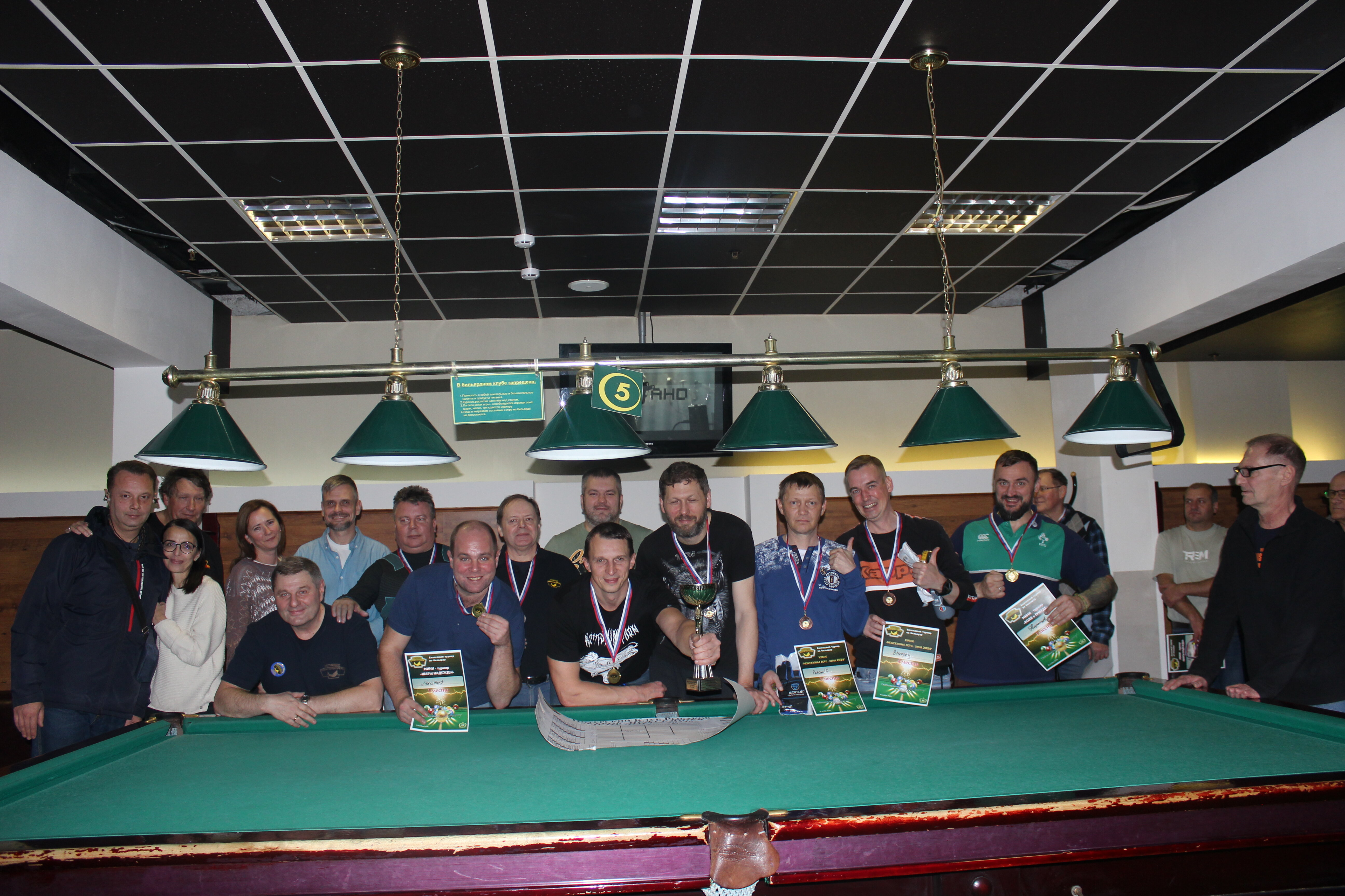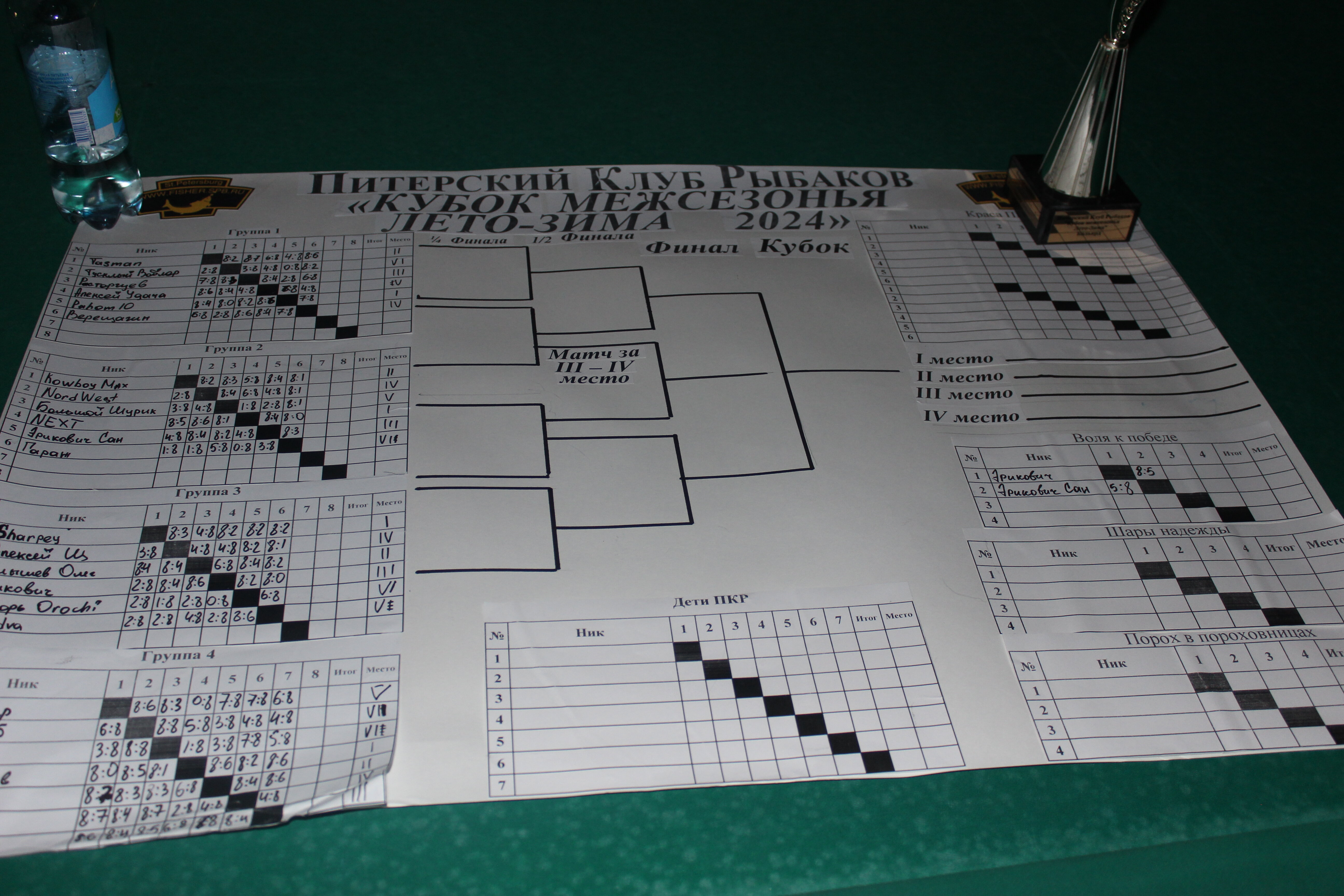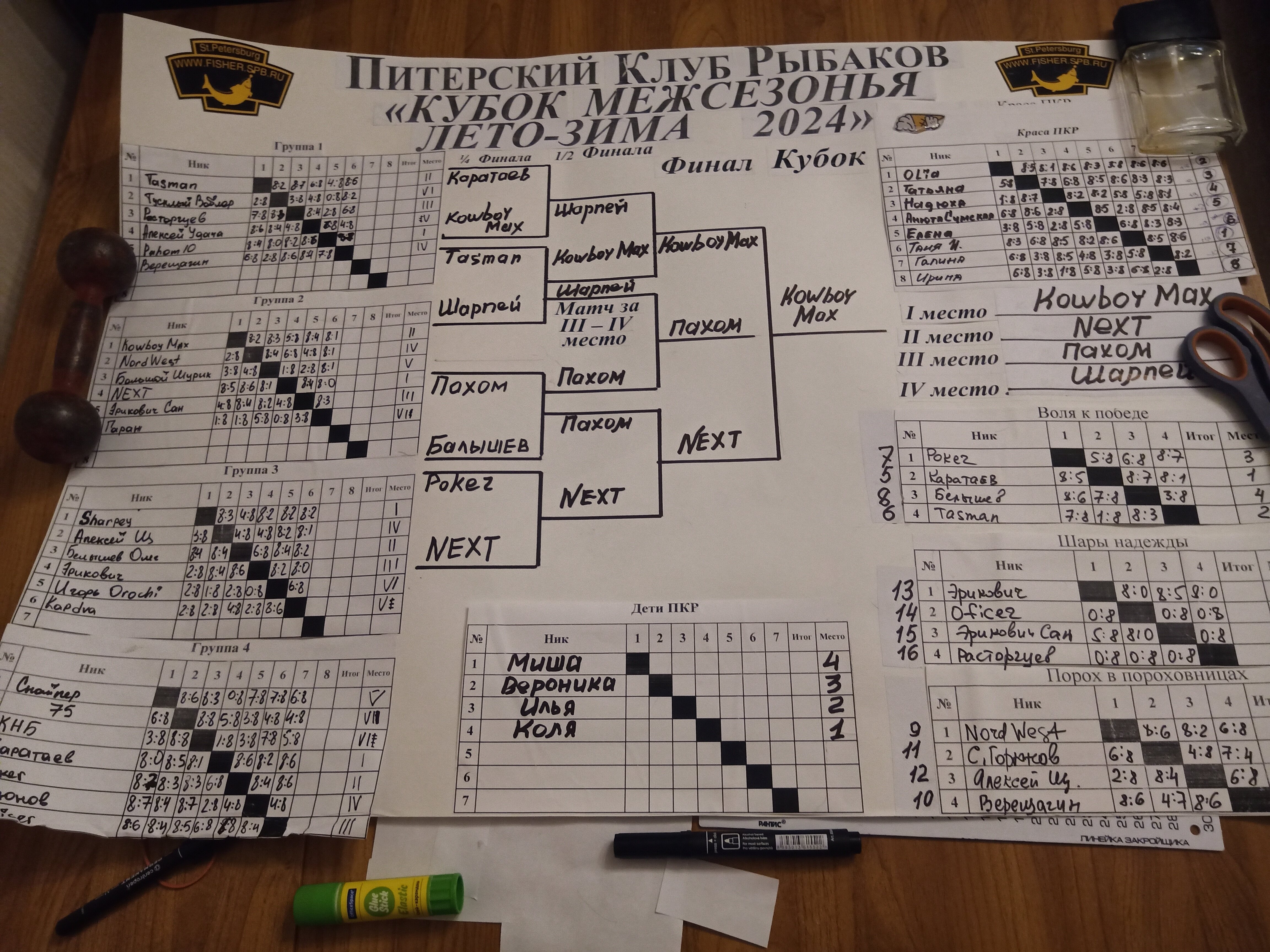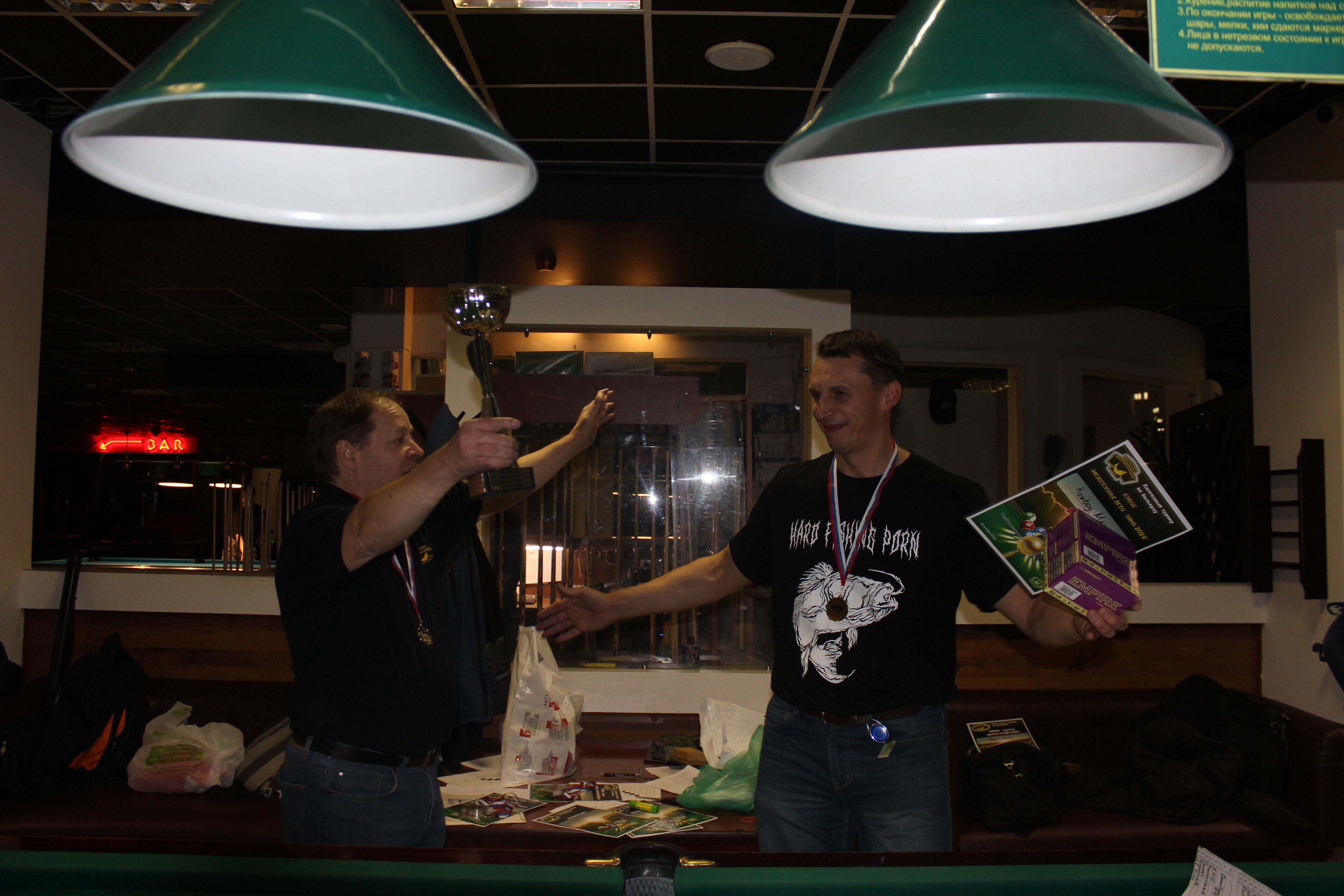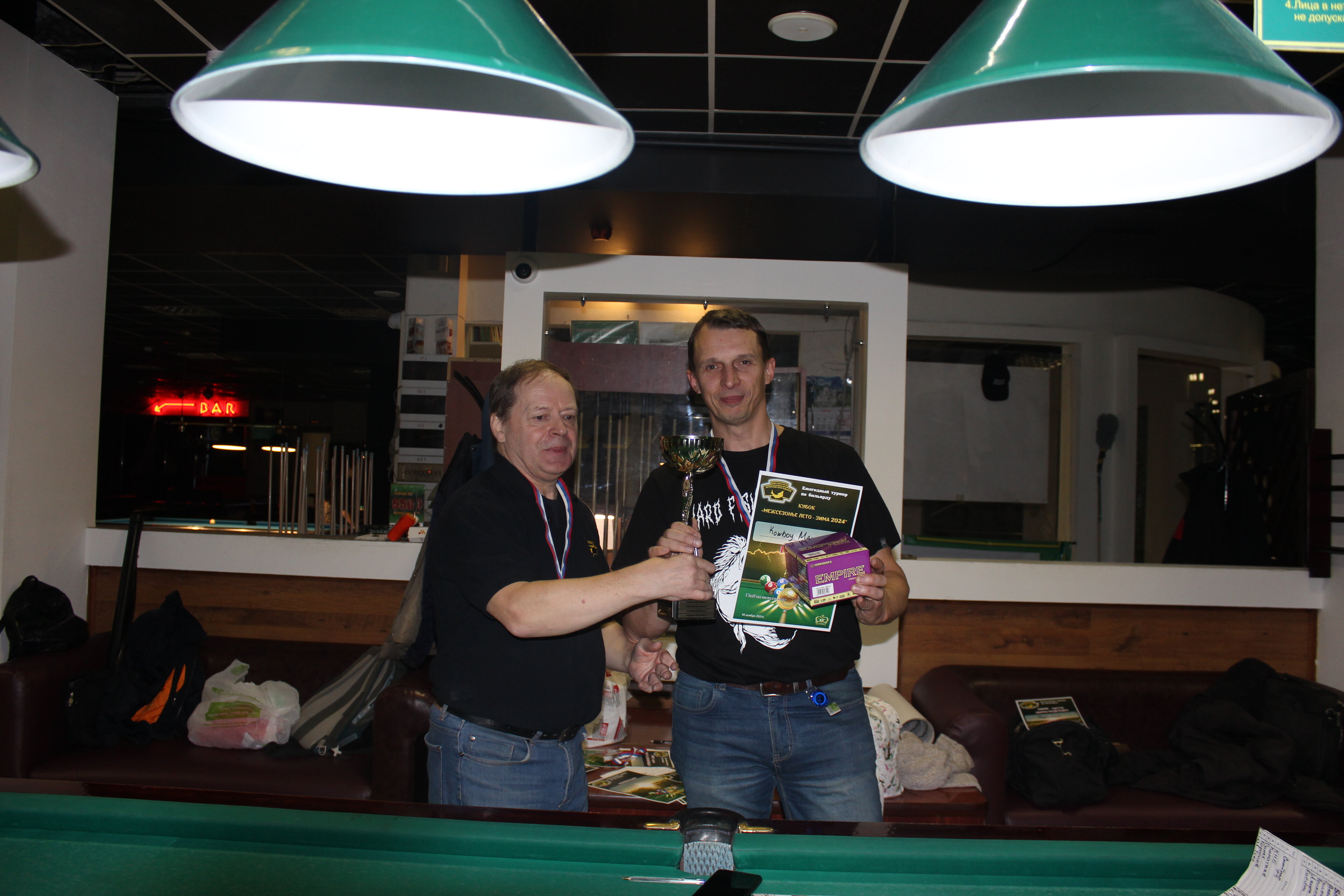 Верещагин Опубликовано: 21 ноября 2024 Жалоба Опубликовано: 21 ноября 2024 (изменено) Первенство ПКР по бильярду "Кубок межсезонья Лето – Зима 2024" ! Участники по факту: Мужчины: 1. Верещагин 2. Sharpey 3. Дима Снайпер 4. Алексей Щ 5. 75-ый 6. Белышев Олег 7. ТусклыЙ Воблер 8. Tasman85 9. Игорь Orochi 10.Эрикович-Сан 11.Эрикович 12. KowboyMax 13. Алексей Удача 14. Poker 15. Kapdva 16. NEXT 17. КНБ 18. Ростислав 19. Горюнов 20. Большой Шурик 21.oFicer 22. NordWest 23. Гараж 24. Pahom10 25 Расторгуев Дамы : 1. Olia 2 Татьяна 3. НадюХа 4. Анюта Сумская 5. Елена 6. Таня И. 7. Галина 8. Ирина Дети: 1. Илья 2. Колян 3. Вероника 4. Миша И снова собрались, поиграли, отдохнули. В этом юбилейном 20-ом турнире удалось провести и дамский турнир с большим количеством участниц -8 и детский- 4 участников. (здесь дружные несмолкающие овации ) Подтянулись достаточно дружно. Предварительно посчитались и оказалось, что заявившихся было слегка побольше. Выпали по разным обстоятельствам достаточно много участников, кто-то не сумел даже предупредить. Лёша Прораб, хоть и не смог участвовать непосредственно в турнире, сумел добраться со мной до клубного склада и забрать призовой фонд, а Кирилл (Тусклый Воблер) помог весь этот праздничный набор, таблицу и меня помог доставить к месту проведения, за что им, конечно, большущее спасибо. Успели четко началу. Итак, размявшись, "отжеребились", сфоткались и ринулись в бой. Стартовые 4 группы сформировались по 6-7 участников. Получилось вполне нарядно. Дамы и дети дружно поддержали турнир и азартно включились в борьбу. Мне не хватило времени последить в подробностях за их игрой , но видел, что там было довольно живенько и весело). Здесь отменно проявили себя мои помощники )НадюХа и Аннушка Сумская. Дима (DEMON) неожиданно захворал и я уже запаниковал, но дамы так активно взялись за организацию, что скоро стало понятно, что девчата справятся. Они-то, собственно, и провели на высочайшем уровне дамский и детский турниры. Оба эти соревнования проводились по специальным правилам, что помогло динамично и интересно добиться желаемых результатов. Ну молодцы же. В высшей степени отличились наши народные спонсоры. Артём "Poker" и конечно же, как всегда, Слава "Гараж". Там и цветы и Бутылочка вкусного вина для дамских финалистов. Спасибище за такую поддержку. Максим "Kowboy MAX" создал традиционные тематические дипломы, которые по достоинству оценили их обладатели. И, конечно же, сам турнир среди мужчин не прошёл бы так организованно и динамично без неоценимой помощи НадюХа и Аннушки, которые с первых минут включилась в работу и весь турнир тащили на себе организаторско - оформительскую часть этого действа. К ней активно подключался Володя kapdva. Да в принципе все участники по ходу турнира подключались активно. Крайне благодарен ребятам за такую поддержку. Спасибо гостям и зрителям. Спасибо Серёге MCHS, который приехал традиционно поболеть и поддержать. Благодарю всех участников турнира, "старичков" и новых бойцов. Спасибо Клубу и компании "Эко-Групп" за помощь в формировании медально-сувенирного фонда. Итоги: Самый преданный болельщик – Сергей MCHS Ветеран турнира- Эрикович Сан За самую длинную серию отмечен Kowboy MAX трижды по 4 шара - Минитурнир "Порох в пороховницах"(4-ые места в группах) 1-е место – NordWest .- медаль, диплом, приз. 2-е место – Верещагин - медаль, диплом, приз 3-е место – C.Горюнов - медаль, диплом, приз. 4-е место – Алексей Щ - медаль, диплом, пр