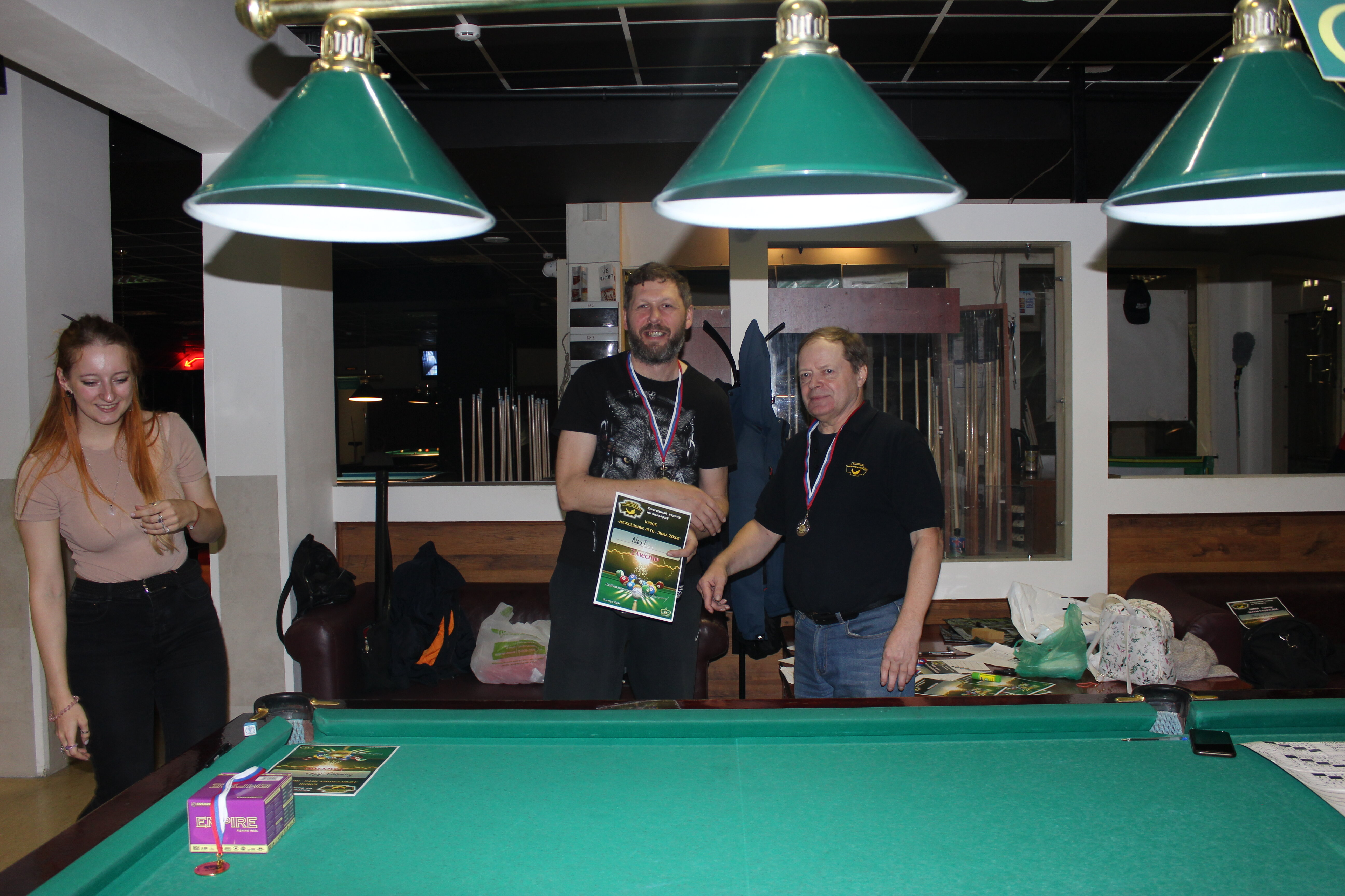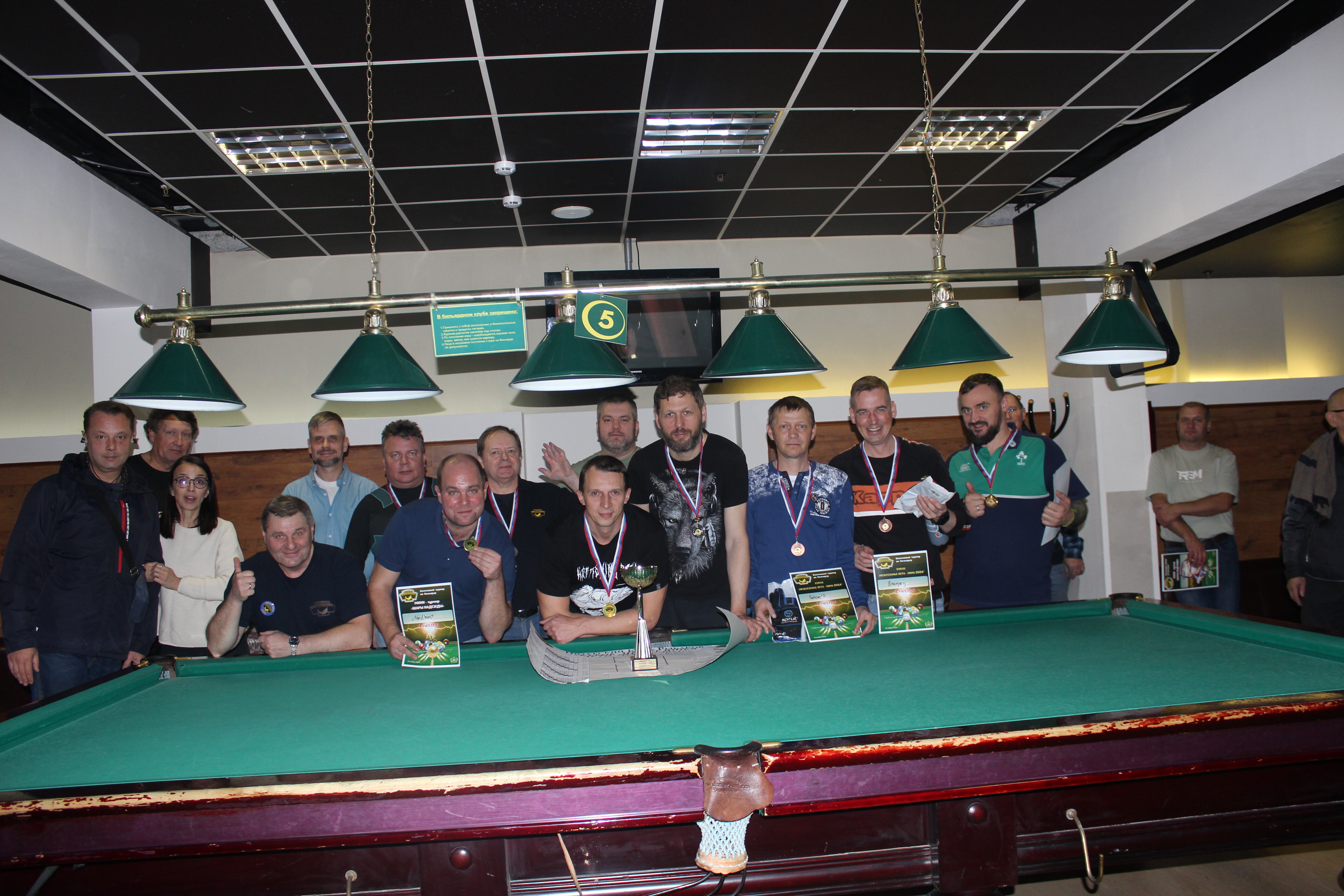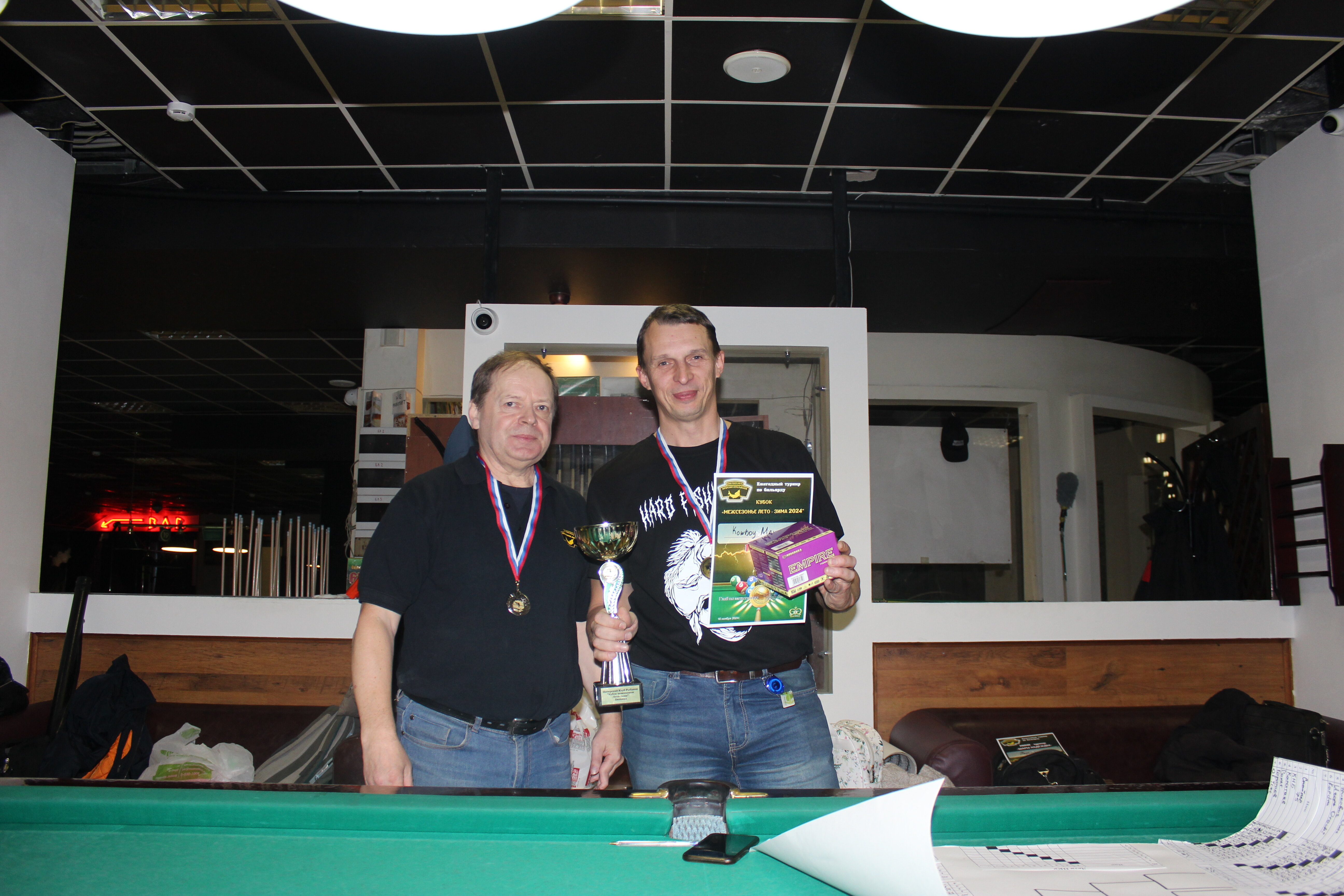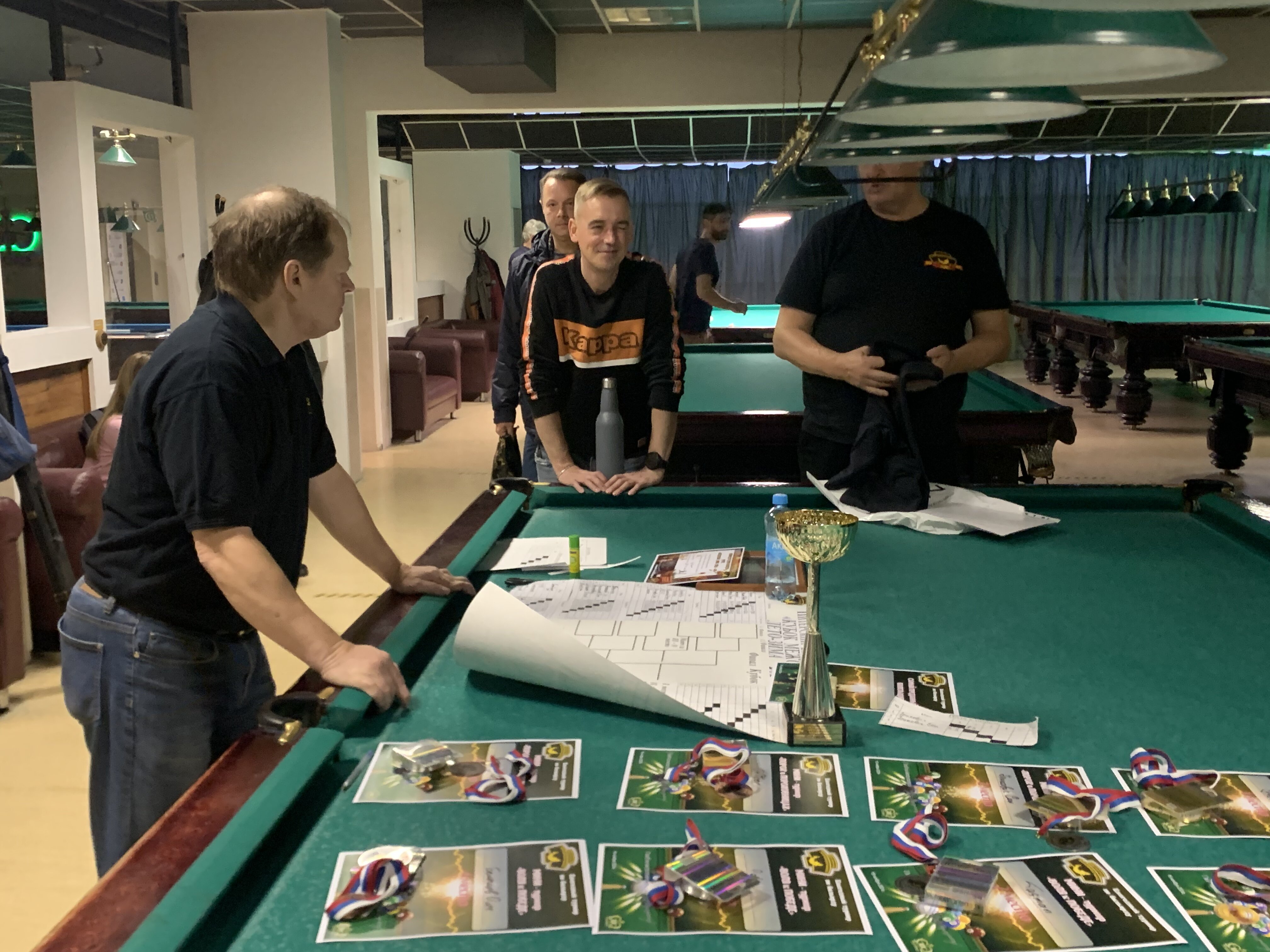 Верещагин Опубликовано: 21 ноября 2024 Жалоба Опубликовано: 21 ноября 2024 (изменено) Первенство ПКР по бильярду "Кубок межсезонья Лето – Зима 2024" ! Участники по факту: Мужчины: 1. Верещагин 2. Sharpey 3. Дима Снайпер 4. Алексей Щ 5. 75-ый 6. Белышев Олег 7. ТусклыЙ Воблер 8. Tasman85 9. Игорь Orochi 10.Эрикович-Сан 11.Эрикович 12. KowboyMax 13. Алексей Удача 14. Poker 15. Kapdva 16. NEXT 17. КНБ 18. Ростислав 19. Горюнов 20. Большой Шурик 21.oFicer 22. NordWest 23. Гараж 24. Pahom10 25 Расторгуев Дамы : 1. Olia 2 Татьяна 3. НадюХа 4. Анюта Сумская 5. Елена 6. Таня И. 7. Галина 8. Ирина Дети: 1. Илья 2. Колян 3. Вероника 4. Миша И снова собрались, поиграли, отдохнули. В этом юбилейном 20-ом турнире удалось провести и дамский турнир с большим количеством участниц -8 и детский- 4 участников. (здесь дружные несмолкающие овации ) Подтянулись достаточно дружно. Предварительно посчитались и оказалось, что заявившихся было слегка побольше. Выпали по разным обстоятельствам достаточно много участников, кто-то не сумел даже предупредить. Лёша Прораб, хоть и не смог участвовать непосредственно в турнире, сумел добраться со мной до клубного склада и забрать призовой фонд, а Кирилл (Тусклый Воблер) помог весь этот праздничный набор, таблицу и меня помог доставить к месту проведения, за что им, конечно, большущее спасибо. Успели четко началу. Итак, размявшись, "отжеребились", сфоткались и ринулись в бой. Стартовые 4 группы сформировались по 6-7 участников. Получилось вполне нарядно. Дамы и дети дружно поддержали турнир и азартно включились в борьбу. Мне не хватило времени последить в подробностях за их игрой , но видел, что там было довольно живенько и весело). Здесь отменно проявили себя мои помощники )НадюХа и Аннушка Сумская. Дима (DEMON) неожиданно захворал и я уже запаниковал, но дамы так активно взялись за организацию, что скоро стало понятно, что девчата справятся. Они-то, собственно, и провели на высочайшем уровне дамский и детский турниры. Оба эти соревнования проводились по специальным правилам, что помогло динамично и интересно добиться желаемых результатов. Ну молодцы же. В высшей степени отличились наши народные спонсоры. Артём "Poker" и конечно же, как всегда, Слава "Гараж". Там и цветы и Бутылочка вкусного вина для дамских финалистов. Спасибище за такую поддержку. Максим "Kowboy MAX" создал традиционные тематические дипломы, которые по достоинству оценили их обладатели. И, конечно же, сам турнир среди мужчин не прошёл бы так организованно и динамично без неоценимой помощи НадюХа и Аннушки, которые с первых минут включилась в работу и весь турнир тащили на себе организаторско - оформительскую часть этого действа. К ней активно подключался Володя kapdva. Да в принципе все участники по ходу турнира подключались активно. Крайне благодарен ребятам за такую поддержку. Спасибо гостям и зрителям. Спасибо Серёге MCHS, который приехал традиционно поболеть и поддержать. Благодарю всех участников турнира, "старичков" и новых бойцов. Спасибо Клубу и компании "Эко-Групп" за помощь в формировании медально-сувенирного фонда. Итоги: Самый преданный болельщик – Сергей MCHS Ветеран турнира- Эрикович Сан За самую длинную серию отмечен Kowboy MAX трижды по 4 шара - Минитурнир "Порох в пороховницах"(4-ые места в группах) 1-е место – NordWest .- медаль, диплом, приз. 2-е место – Верещагин - медаль, диплом, приз 3-е место – C.Горюнов - медаль, диплом, приз. 4-е место – Алексей Щ - медаль, диплом, пр