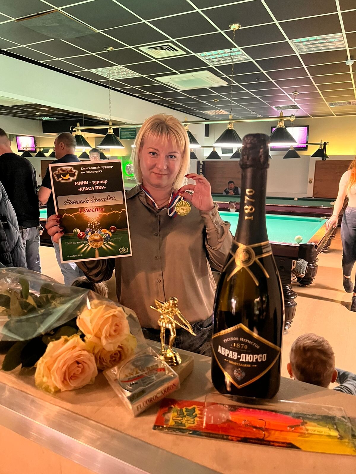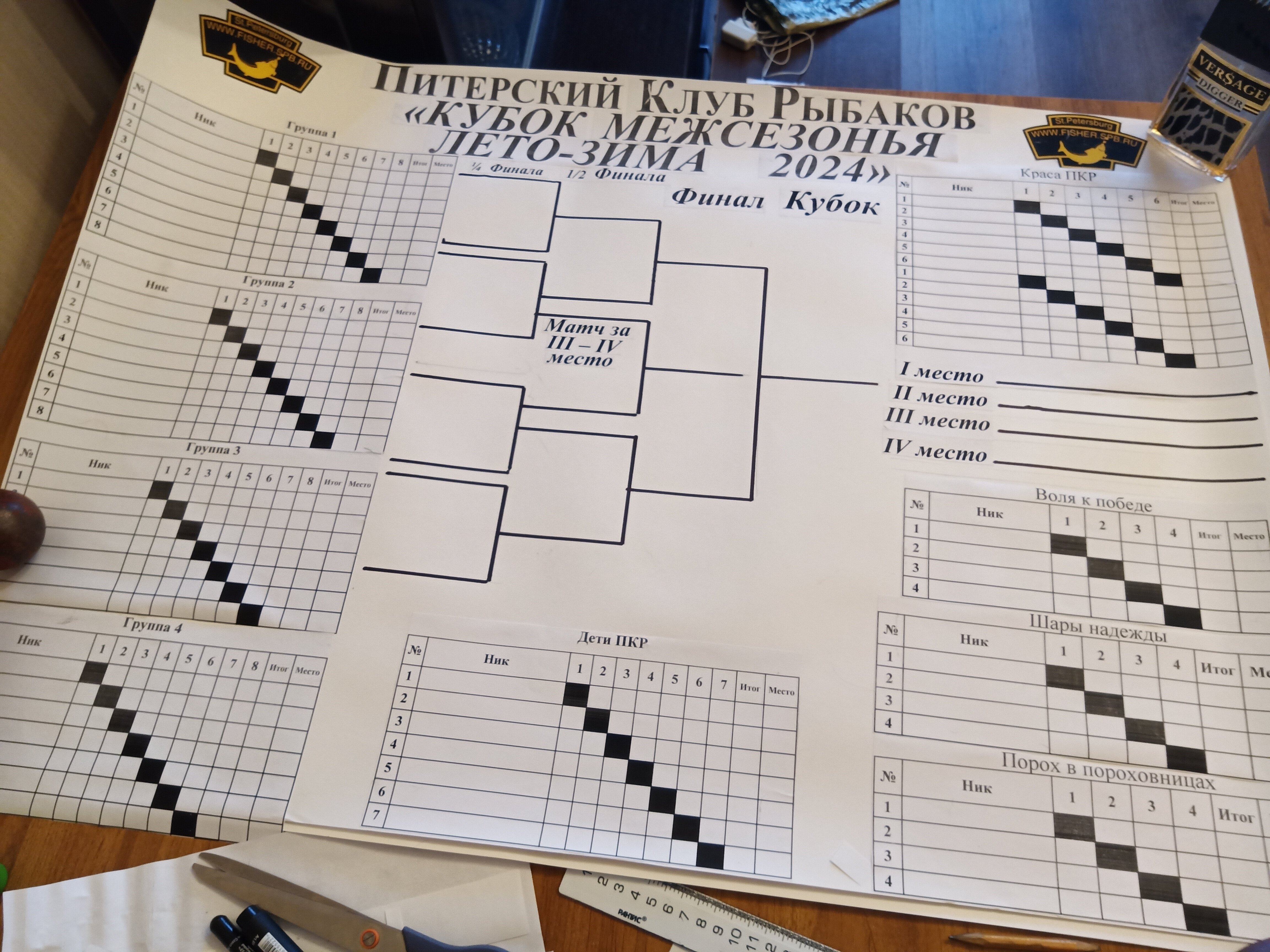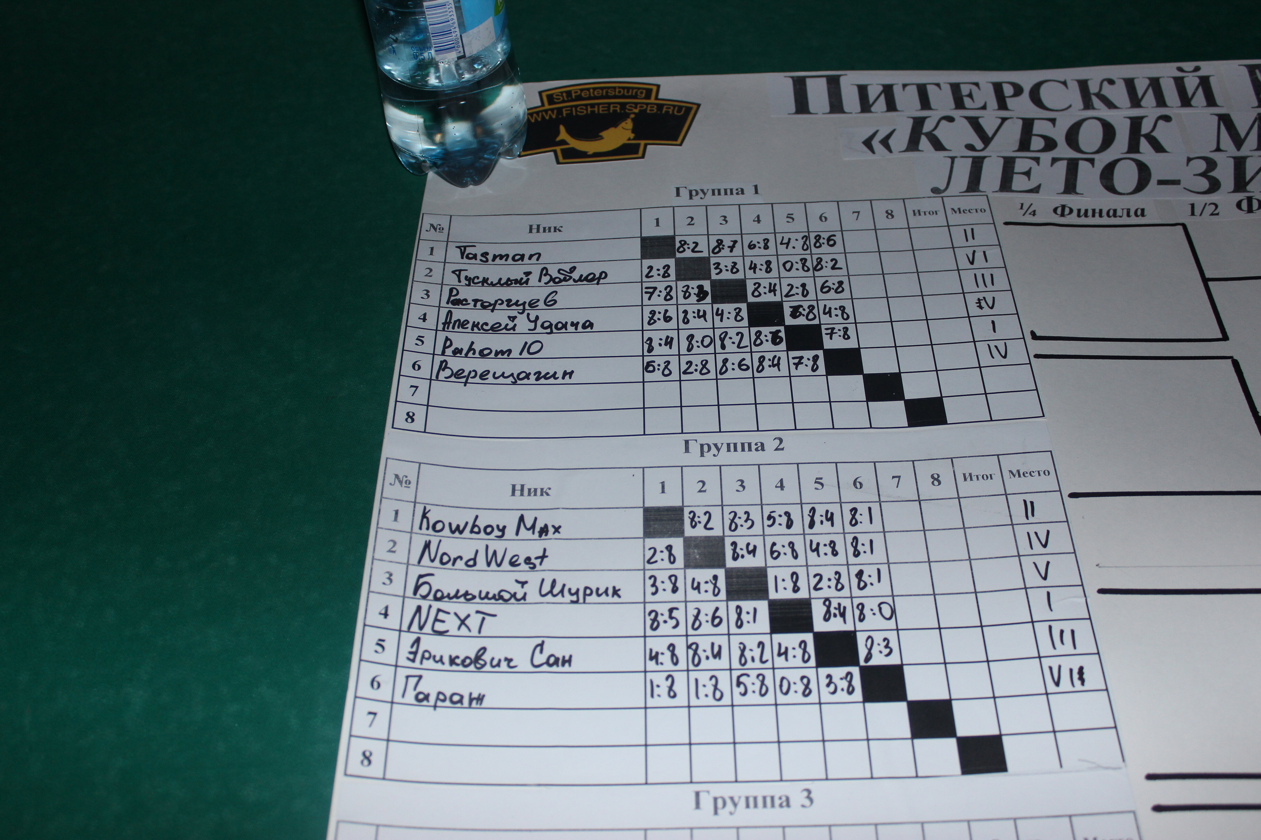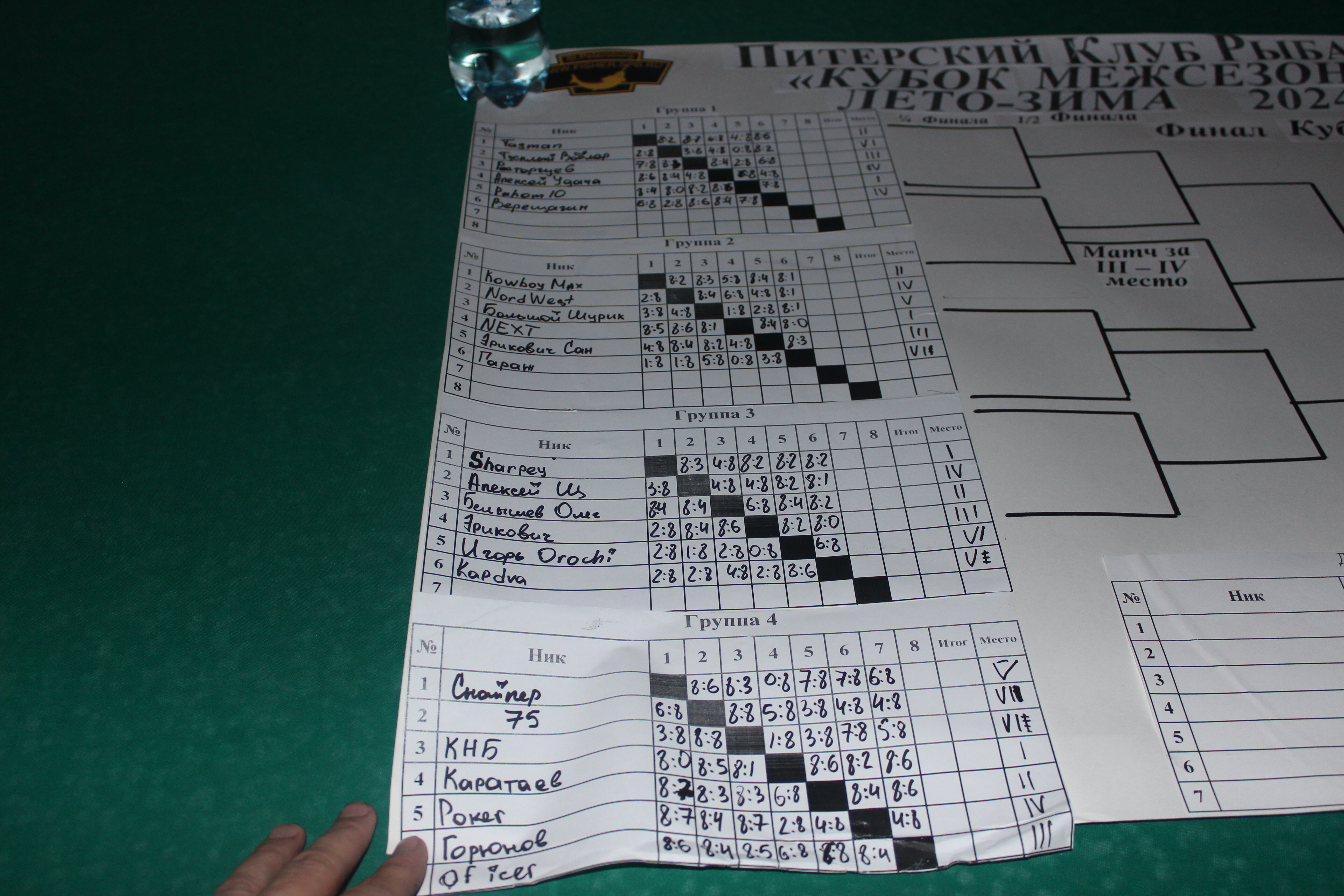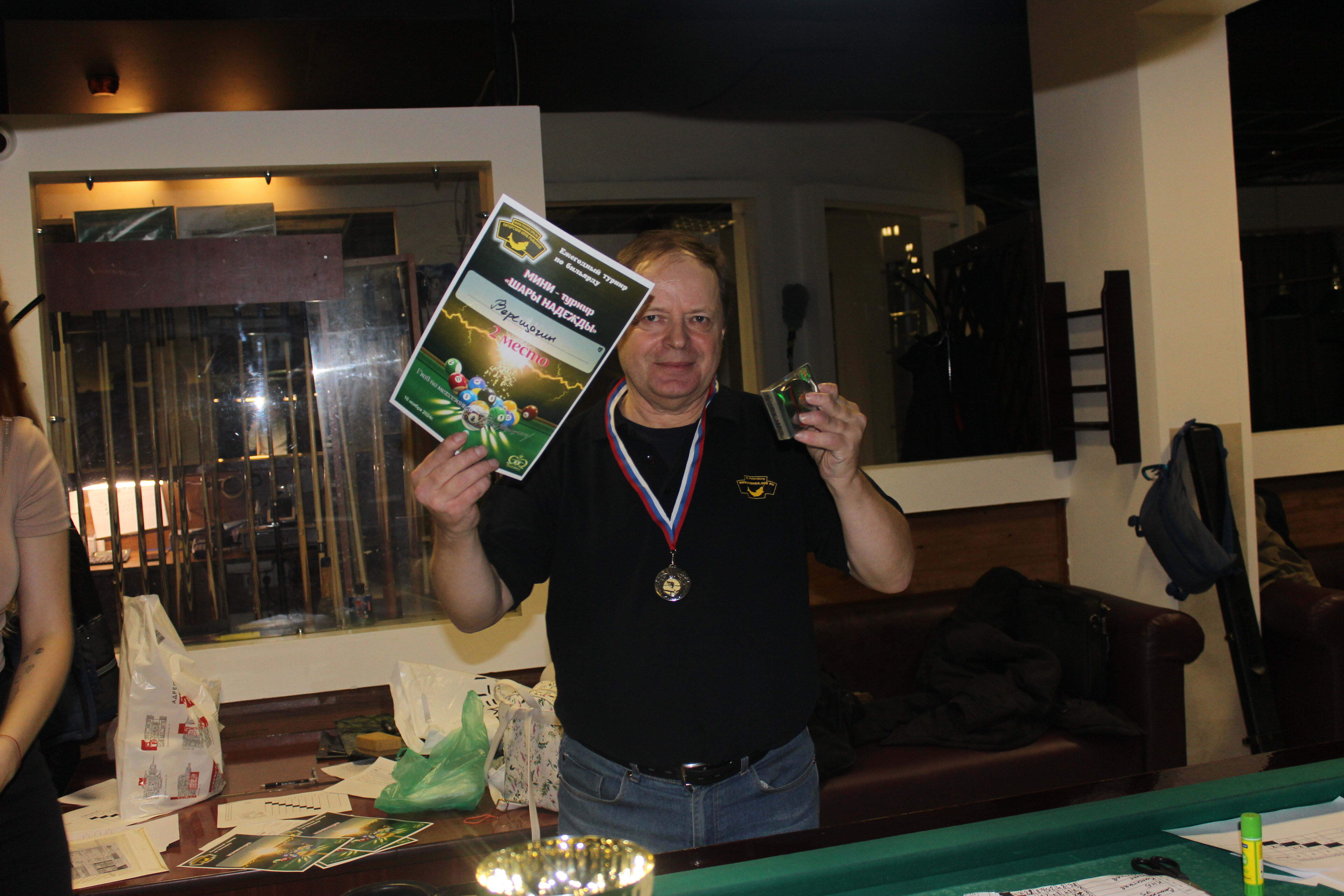 Верещагин Опубликовано: 21 ноября 2024 Жалоба Опубликовано: 21 ноября 2024 (изменено) Первенство ПКР по бильярду "Кубок межсезонья Лето – Зима 2024" ! Участники по факту: Мужчины: 1. Верещагин 2. Sharpey 3. Дима Снайпер 4. Алексей Щ 5. 75-ый 6. Белышев Олег 7. ТусклыЙ Воблер 8. Tasman85 9. Игорь Orochi 10.Эрикович-Сан 11.Эрикович 12. KowboyMax 13. Алексей Удача 14. Poker 15. Kapdva 16. NEXT 17. КНБ 18. Ростислав 19. Горюнов 20. Большой Шурик 21.oFicer 22. NordWest 23. Гараж 24. Pahom10 25 Расторгуев Дамы : 1. Olia 2 Татьяна 3. НадюХа 4. Анюта Сумская 5. Елена 6. Таня И. 7. Галина 8. Ирина Дети: 1. Илья 2. Колян 3. Вероника 4. Миша И снова собрались, поиграли, отдохнули. В этом юбилейном 20-ом турнире удалось провести и дамский турнир с большим количеством участниц -8 и детский- 4 участников. (здесь дружные несмолкающие овации ) Подтянулись достаточно дружно. Предварительно посчитались и оказалось, что заявившихся было слегка побольше. Выпали по разным обстоятельствам достаточно много участников, кто-то не сумел даже предупредить. Лёша Прораб, хоть и не смог участвовать непосредственно в турнире, сумел добраться со мной до клубного склада и забрать призовой фонд, а Кирилл (Тусклый Воблер) помог весь этот праздничный набор, таблицу и меня помог доставить к месту проведения, за что им, конечно, большущее спасибо. Успели четко началу. Итак, размявшись, "отжеребились", сфоткались и ринулись в бой. Стартовые 4 группы сформировались по 6-7 участников. Получилось вполне нарядно. Дамы и дети дружно поддержали турнир и азартно включились в борьбу. Мне не хватило времени последить в подробностях за их игрой , но видел, что там было довольно живенько и весело). Здесь отменно проявили себя мои помощники )НадюХа и Аннушка Сумская. Дима (DEMON) неожиданно захворал и я уже запаниковал, но дамы так активно взялись за организацию, что скоро стало понятно, что девчата справятся. Они-то, собственно, и провели на высочайшем уровне дамский и детский турниры. Оба эти соревнования проводились по специальным правилам, что помогло динамично и интересно добиться желаемых результатов. Ну молодцы же. В высшей степени отличились наши народные спонсоры. Артём "Poker" и конечно же, как всегда, Слава "Гараж". Там и цветы и Бутылочка вкусного вина для дамских финалистов. Спасибище за такую поддержку. Максим "Kowboy MAX" создал традиционные тематические дипломы, которые по достоинству оценили их обладатели. И, конечно же, сам турнир среди мужчин не прошёл бы так организованно и динамично без неоценимой помощи НадюХа и Аннушки, которые с первых минут включилась в работу и весь турнир тащили на себе организаторско - оформительскую часть этого действа. К ней активно подключался Володя kapdva. Да в принципе все участники по ходу турнира подключались активно. Крайне благодарен ребятам за такую поддержку. Спасибо гостям и зрителям. Спасибо Серёге MCHS, который приехал традиционно поболеть и поддержать. Благодарю всех участников турнира, "старичков" и новых бойцов. Спасибо Клубу и компании "Эко-Групп" за помощь в формировании медально-сувенирного фонда. Итоги: Самый преданный болельщик – Сергей MCHS Ветеран турнира- Эрикович Сан За самую длинную серию отмечен Kowboy MAX трижды по 4 шара - Минитурнир "Порох в пороховницах"(4-ые места в группах) 1-е место – NordWest .- медаль, диплом, приз. 2-е место – Верещагин - медаль, диплом, приз 3-е место – C.Горюнов - медаль, диплом, приз. 4-е место – Алексей Щ - медаль, диплом, пр
