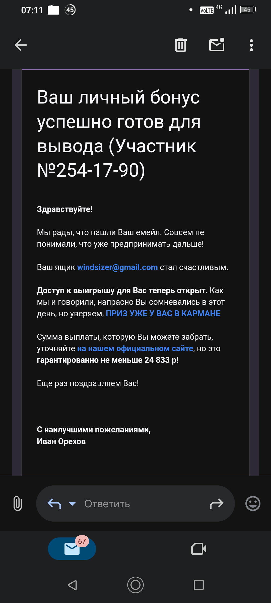Dreamer Опубликовано: 14 марта Жалоба Опубликовано: 14 марта (изменено) 1 час назад, Флибустьер Залива сказал: А за ним пришло письмо с выйгрышем. А от кого письмо-то, что там в заголовках, или хотя бы просто в адресе отправителя? Почему вы решили, что это от ПКР пришло? Изменено 14 марта пользователем Dreamer Поделиться сообщением Ссылка на сообщение Поделиться на других сайтах More sharing options...
