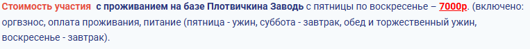 Стоимость участияс проживанием на базе Плотвичкина Заводь с пятницы по воскресенье –7000р. (включено: оргвзнос, оплата проживания, питание (пятница - ужин, суббота - завтрак, обед и торжественный ужин, воскресенье - завтрак).