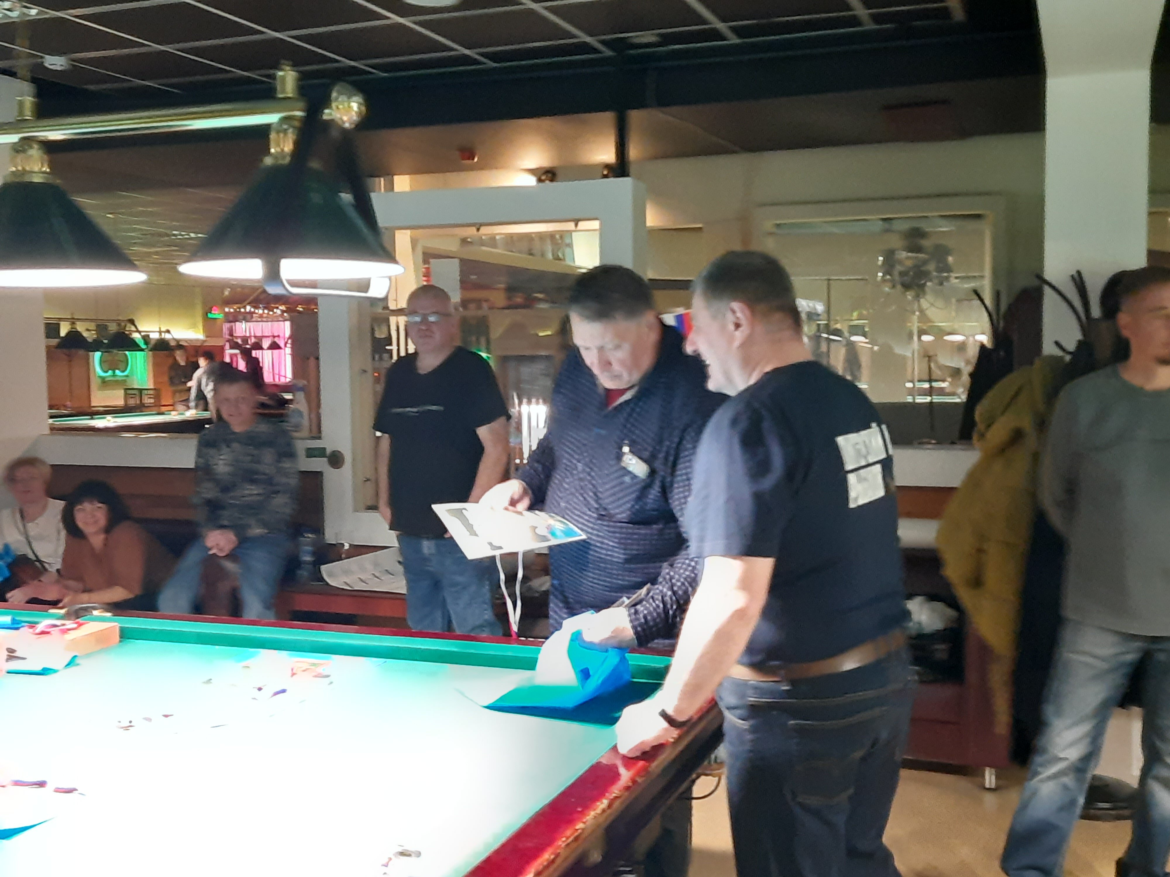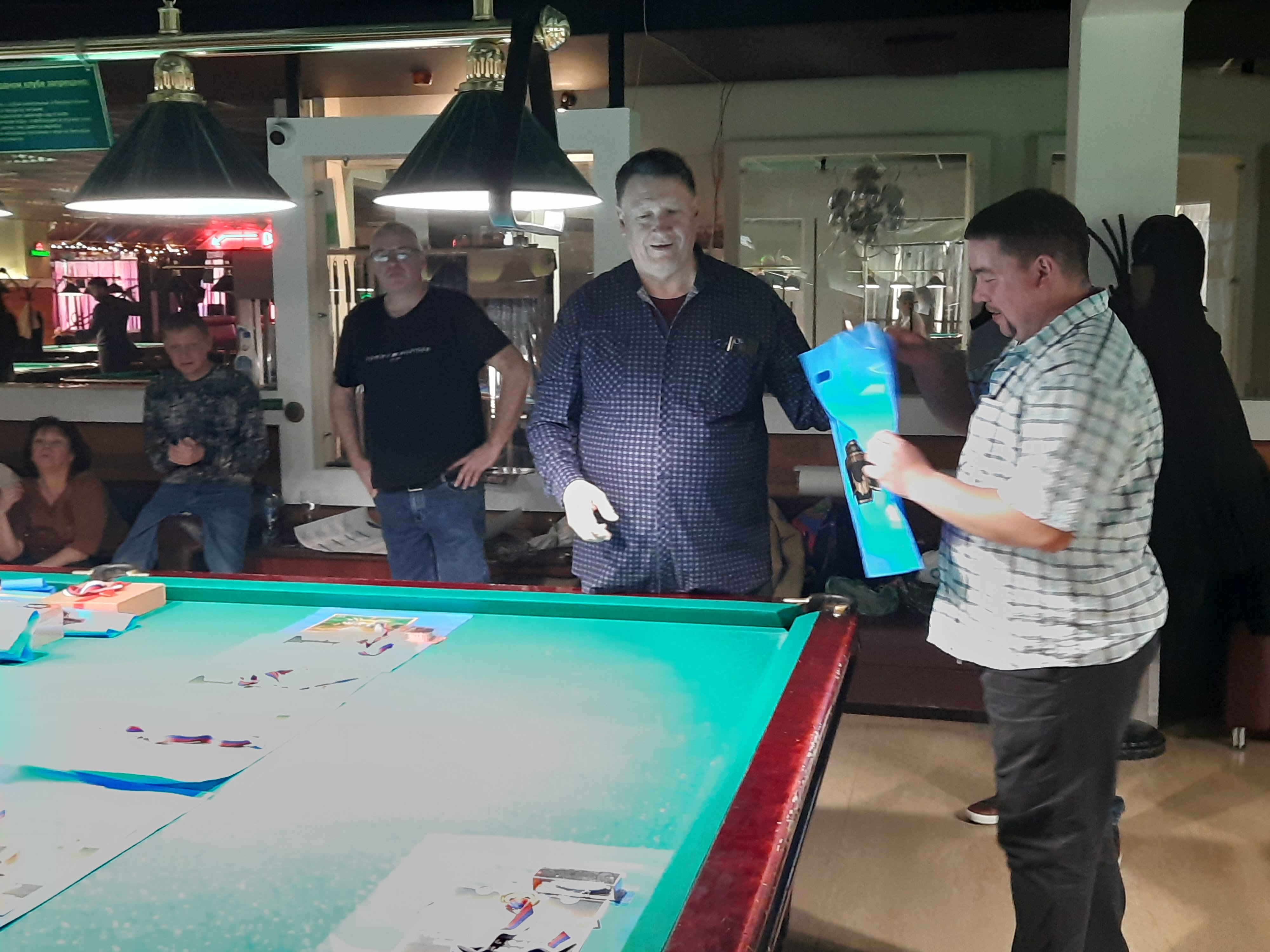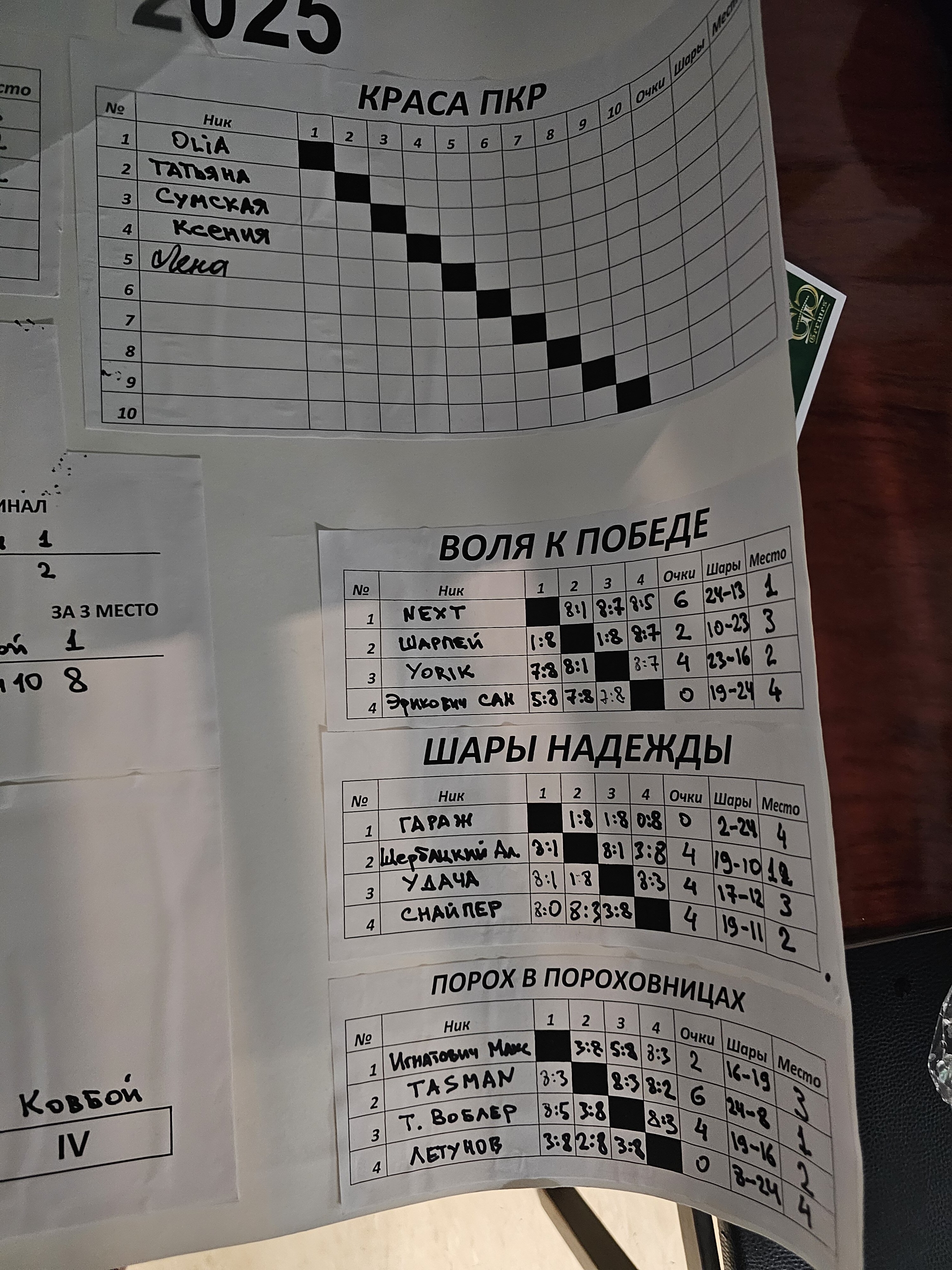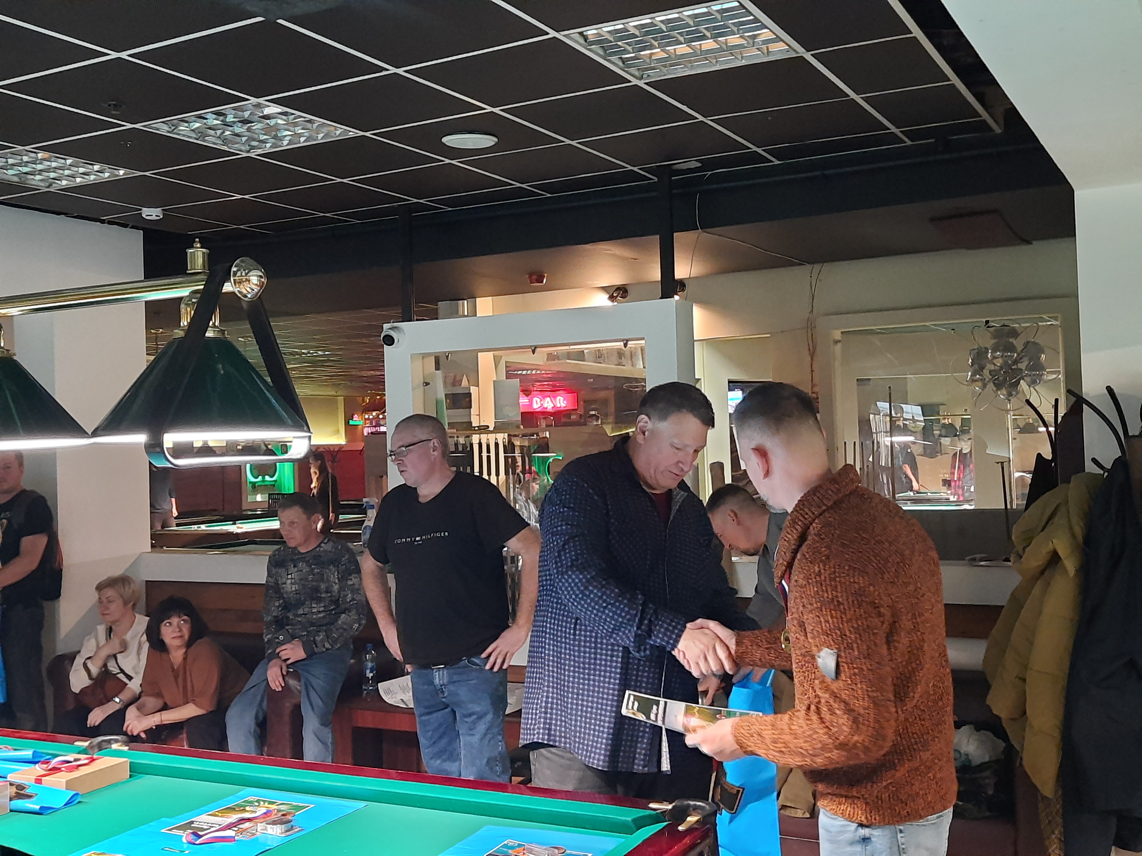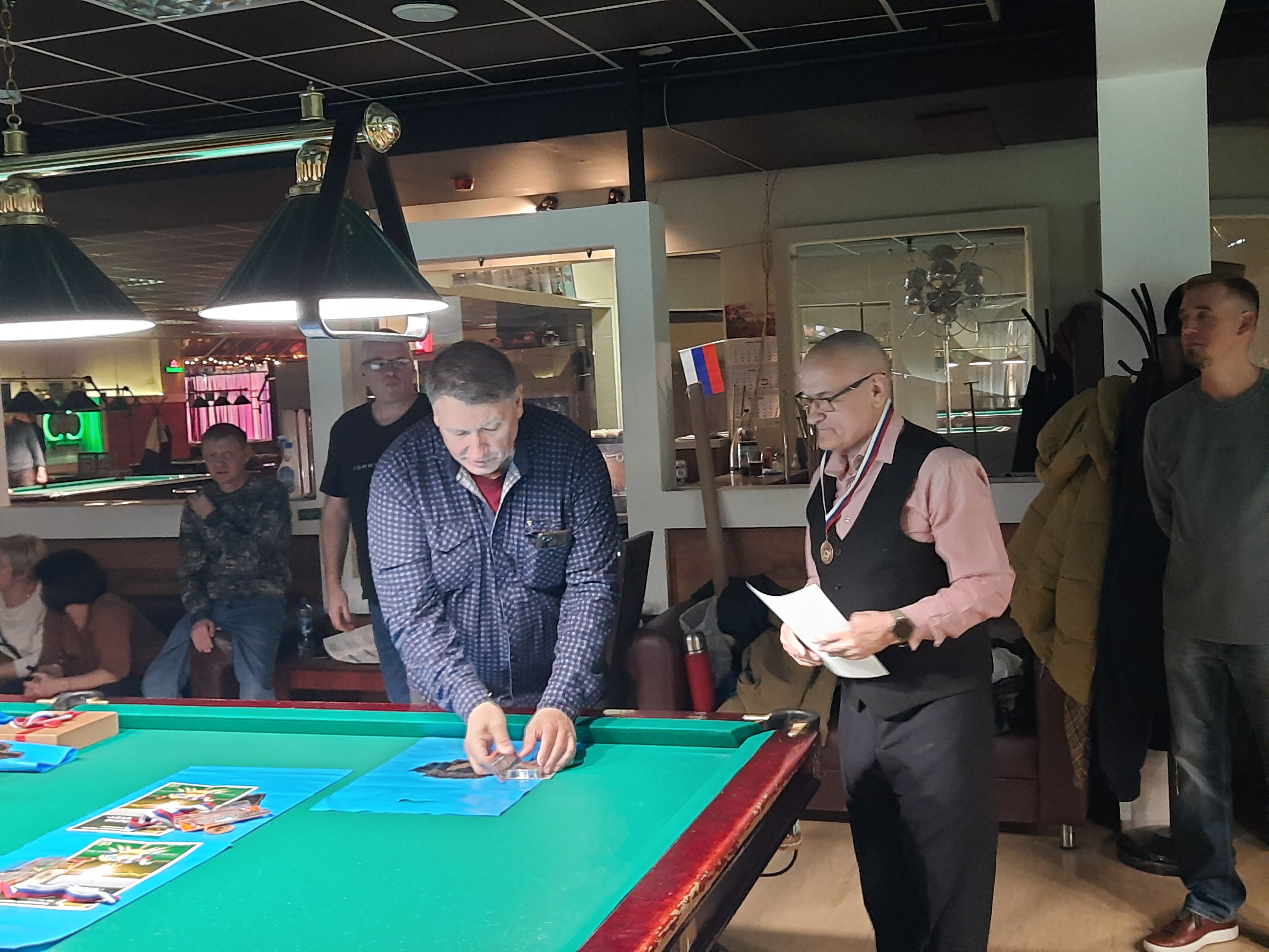 Tasman Опубликовано: 17 ноября Жалоба Опубликовано: 17 ноября Эта была славная битва! В одном месте собрались самые матерые волки, львицы и и младшее поколение перенимающее опыт. Пот, слезы, скрежет зубов и изредка доносящиеся стоны от поражений или громкие восклицания от побед заполонили эту территорию. В воздухе летал дух ожесточенной борьбы... Кто то делал подножки, кто то отодвигал стол в момент удара соперника, кто то забирался на стол и перехватывал летящие шары в лузу. Но это не остановило самых стойких взойти на пьедестал. Просушив сукно от слез и пота началась уже праздничная часть награждения. Всех был рад видеть! Спасибо как всегда нашим неравнодушным "Оргам", которые взяли на себя организацию мероприятия. Очень получилось душевно. А то сидели бы по пещерам да грызли бы кость. По братски, от души!!! Поделиться сообщением Ссылка на сообщение Поделиться на других сайтах More sharing options...