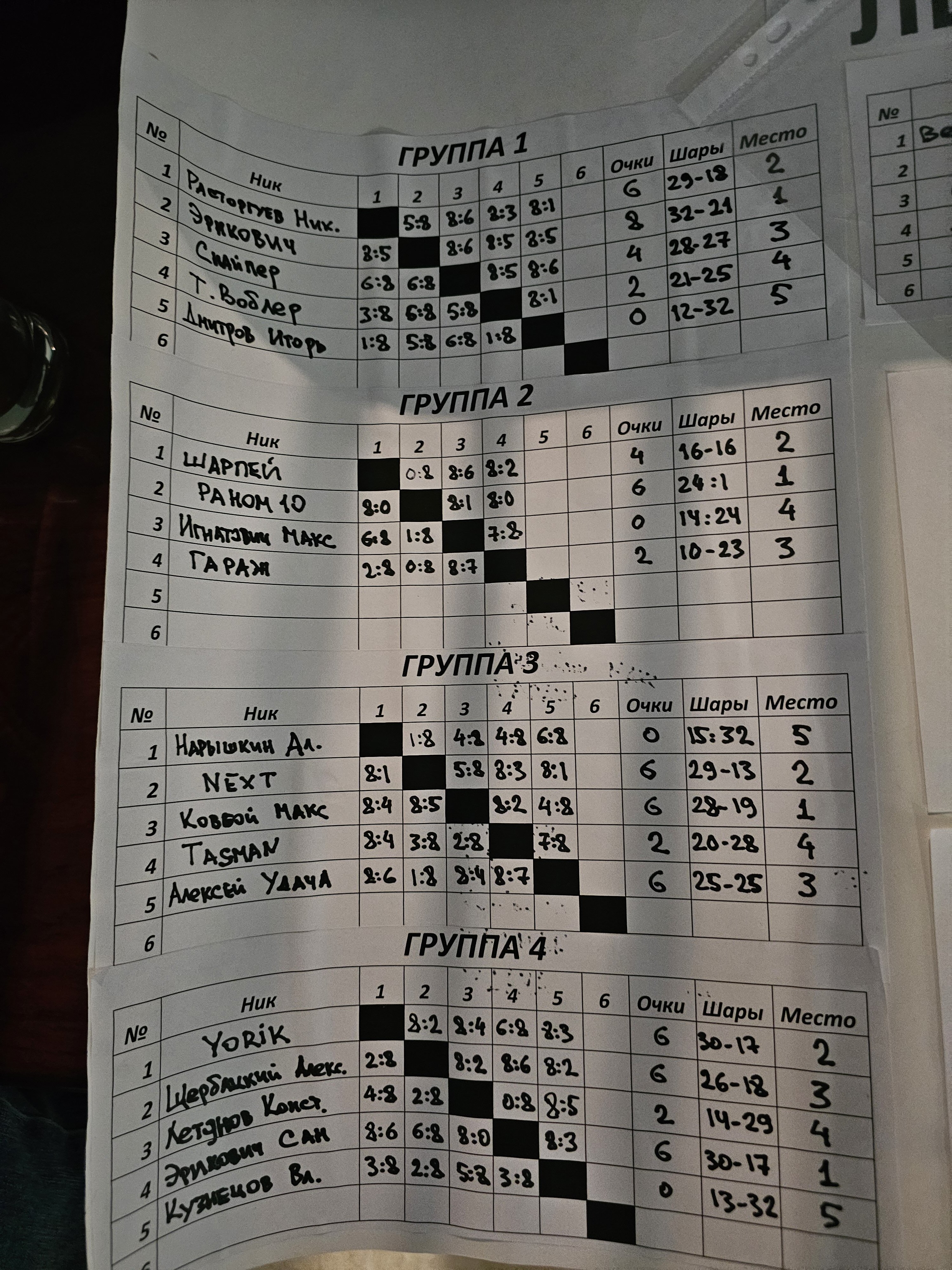 pvska Опубликовано: 16 ноября Жалоба Опубликовано: 16 ноября Как вариант. Проводить жеребьевку с ранжированием игроков заранее в разные группы на основе предыдущих турниров (усредненные 1-4 места - первые сеяные в группах, усредненные 5-8 места - вторые сеяные в группах) в целях более равномерного распределения сильных игроков. Подобная жеребьевка проводится почти на всех турнирах. Поделиться сообщением Ссылка на сообщение Поделиться на других сайтах More sharing options...