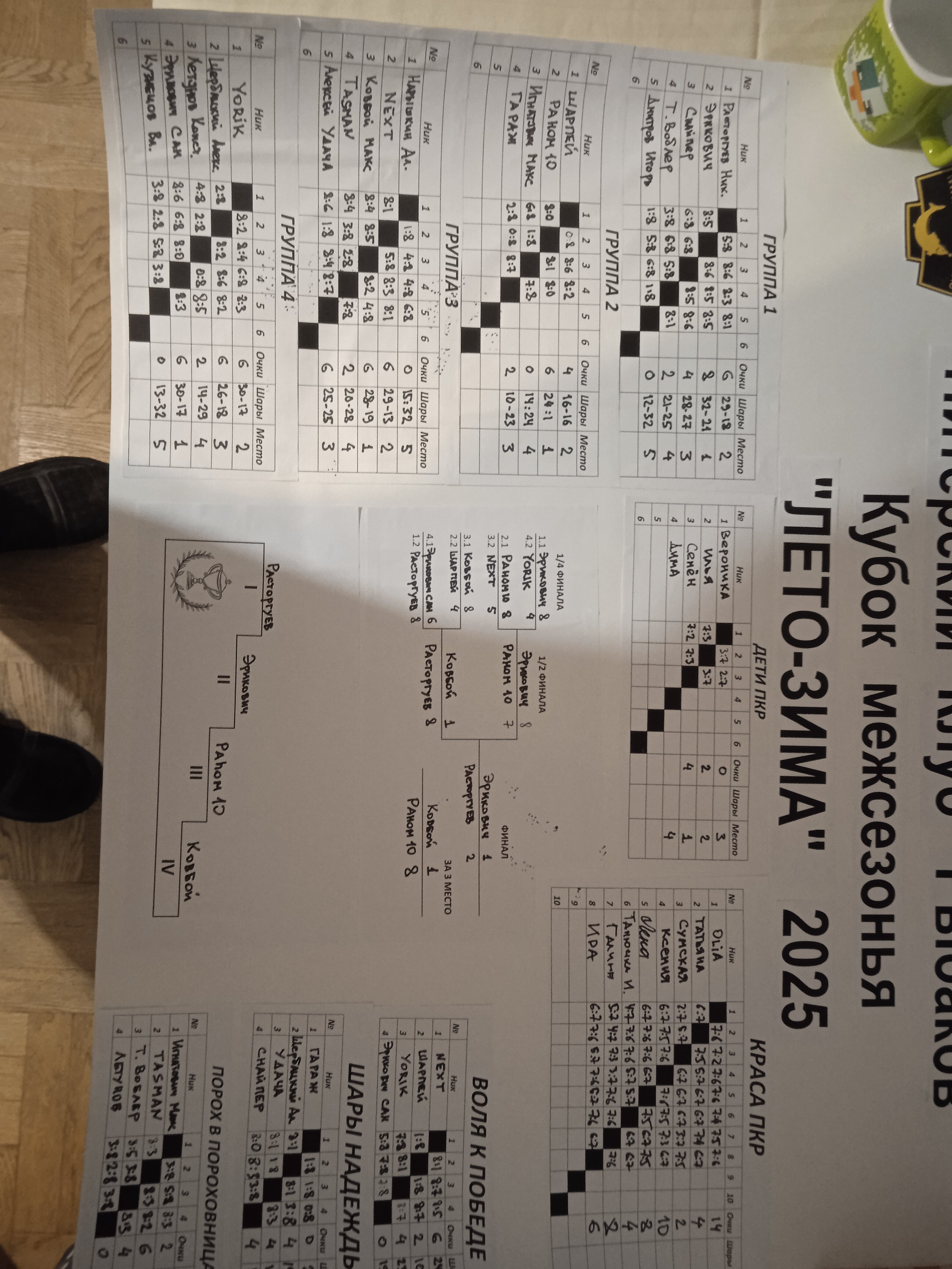 Прораб Леха Опубликовано: 16 ноября Жалоба Опубликовано: 16 ноября Давайте поблагодарим организаторов: Колю КНБ за ведение мероприятия Ковбоя Макса за изготовление дипломов Тому за получение медалей и апгрейд Кубка. Аню Сумскую за проведение женского пула и общую помощь Славу Гаража за шикарные призы для победителей. Ну и бессменному предводителю Мише Верещагину за общее руководство, консультации и заботу. Поделиться сообщением Ссылка на сообщение Поделиться на других сайтах More sharing options...