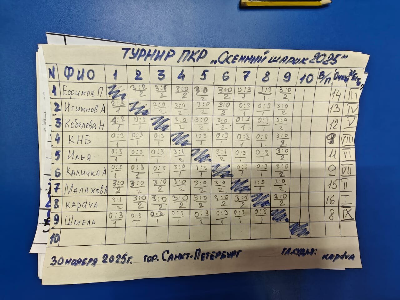 pvska Опубликовано: 30 ноября Жалоба Опубликовано: 30 ноября Молодцы! Поздравляю первое место со всеми выигранными партиями, поздравляю последнее место со всеми проигранными партиями и не взятыми ни одного сета. Похоже на опечатку: у 7-го места должно быть 10 очков, а не 9 очков. Но это не меняет общий расклад. Интересна информация детальная по счету в каждом сете для понимания остроты борьбы. Предполагаю, что эта статистика не велась, но могла бы быть нужна при определении мест при прочих равных. Поделиться сообщением Ссылка на сообщение Поделиться на других сайтах More sharing options...