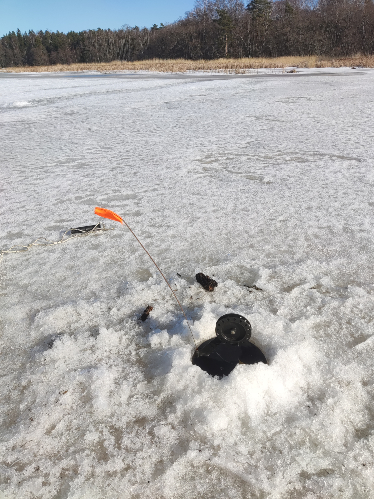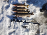 После фиаско на Ладоге, решил проверить зубастую в своем заветном, как говорит сын "логове щук". В 4:00 подъем, кофе сборы и погнал, в 7 на льду, забурил пять лунок и... задымился шуруповерт. Вот как так-то, что самое обидное, запасной остался на даче. С кислой миной. выставил пяток и поехал в Выборг за ручным инструментом (как быстро привыкаешь к хорошему, ручным подзамахался бурить, часто переставлялся.). В итоге убил почти два часа на поездки. По возвращению три загара, но холостые. К 11ти расставился и началась беготня, в большинстве в пустую. До половины третьего выловил восемь штук, две хорошие и два недомерка (заглотили по самое не хочу) забрал, остальные отпущены.