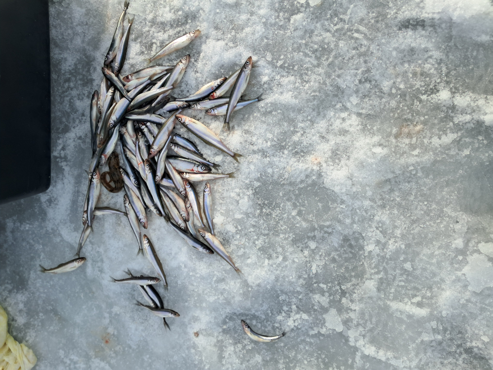 Сегодня с 9.00 до 17.30. Глубина 19 - 21 метр. Насадка карась и креветка рыбе были мало интересны. А вот свежая бельдюга сегодня была главным блюдом. Итог 102 корюшины ( размер разный) и две бельдюги ( порезаны на насадку). Лёд отличный, хоть и присутствует вода вперемешку со снегом. Где ловил там воды не было.