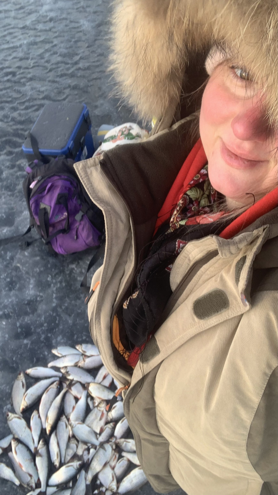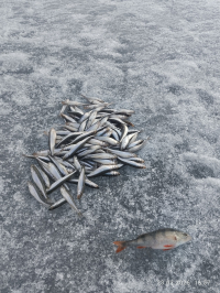 Лед ещё держит, но думаю дня 2 и ему конец. Очень много местами лёд уже на игле. Доехали на аэролодке на 10 километр. Встали подальше от толпы, закормились. Ветер был неприятный, поэтому ушли в палатки. С 15 до 17:30 клева почти не было, рыбу надо было искать. Но мы на ветру бегать (тем более по такому льду) не рискнули. С 17:30 рыбка подошла и к нашим лункам. Решили всё-таки остаться на ночь. Ночью рыбка клевала хорошо с небольшими перерывами (с 22 до 01:30, с 2:30 до 4:30, с 5 до 6). В нашей компании у всех клевало по-разному. Лично я сменила 10 мормышек, остановилась на козе с подсадкой опарыша. Брала только на игру на падении. На стоячку почти не клевала. У друзей клевала на стоячку на 2 крючка. Подкармливали рыбу постоянно. По итогу у меня 10 кг плотвы и густеры. У друзей на каждого по 8-10 кг ! Мы довольны )) замерзли немного, устали сильно, но что хотели получили !))) И на жареху, и на вялку, и на фарш хватит !Уехали домой в 8 утра. На фото улов не весь, лень было всю рыбку из пакетов доставать !)