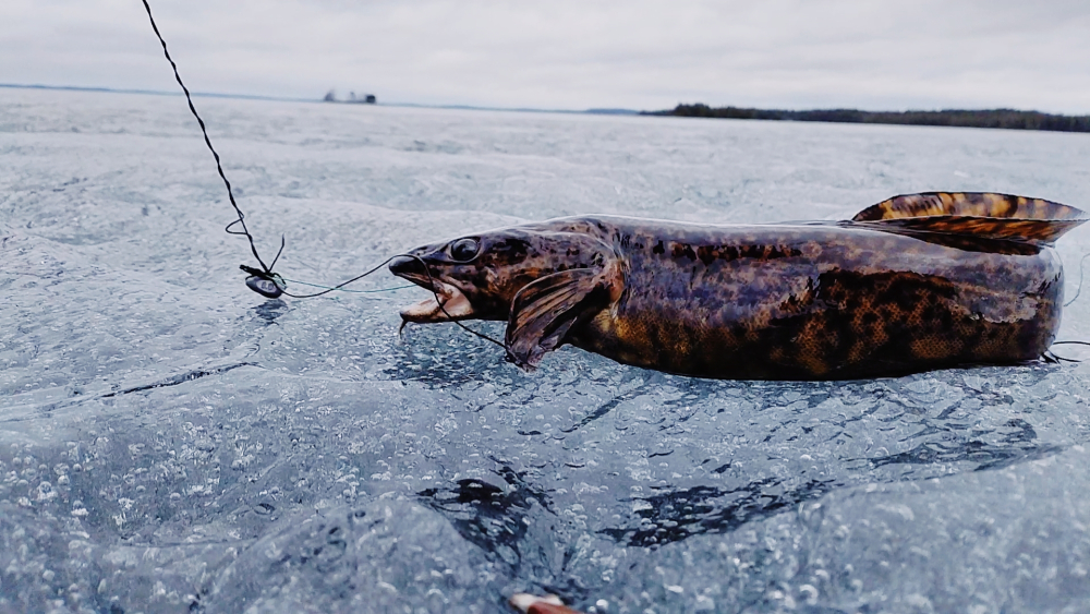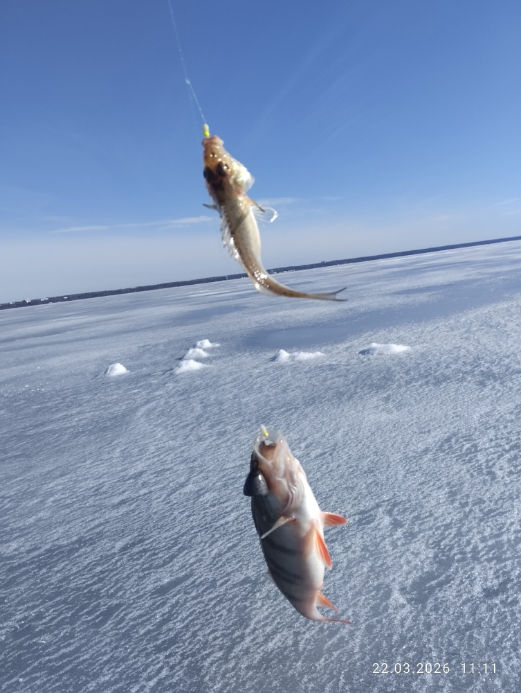 Сегодня с утра дождик, выдвинулись на любимое дело, природа сразу подарила ясное небо с солнцем, облаками и сильным ветром. Очень тепло, варежки, перчатки не нужны. Стали обрабатывать вчерашние лунки в надежде на полосатых толстых кочегаров. Но, увы, местечко молчало. Константин мокал железо, я мормышил. Передвинулись и по пути проверили жерлицы. Аллилуйя, вот он, карельский чёрный налим до килограмма. Невелик, но мы нашли его тропу. Дальше почти на всех точках как из пулемёта мелкий, средний окунь. Надёргали живцов, на завялку и на поесть пузатики попадались. Нужно отдать должное академику железного дела, гуру Константину, он выцеплял на блесну окуней хорошего размера. Я не сразу, но подобрал безмотылку и зарядами по 15+- штук с одной лунки брал. Перезарядили на живцов вчерашние жерлицы и добавили ещё внушительное количество до обеда и после уже с живцами. Рыбачим на глубинах от 5 - 6+ метров. Вокруг никого, машем руками как вздумается. Сегодня ужинали на улице, провожали светило за горизонт. Солнце утонуло в тучи, надвигается фронт. Ветер усиливается, ждём капли плачущих небес. Главное, мы ко всему готовы и кайфуем дальше. Пойду на алтайском комусе поиграю, нашаманю добра. Завтра будем пожинать.
