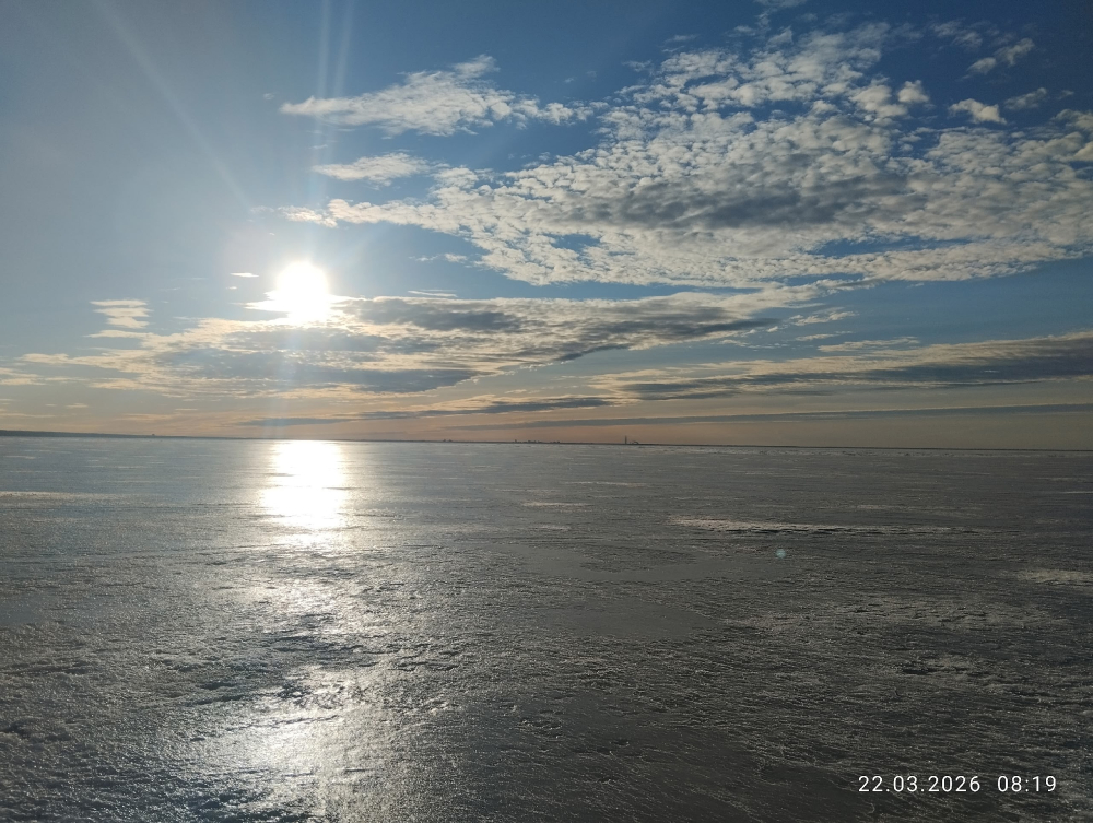 Сегодня открыл сезон за два года и сегодня же закрыл. 23.03.26. Выход на лед около восьми по ступеням шаолиньского монастыря ( слева от пляжа). Вышел- ни кого... Но я ожидал этого- знал на что шел. На правую руку нож на темляке, на левый локоть- ватрушку детскую на удавку, шнек разложил сразу- привязал к ящику ( веревка длинная к лыжам). Ветер западный сильный, дошел по тропе более- менее. лед-шнек. Через пол часа ко мне пришли еще двое: один с доской)) второй тоже с ватрушкой, сели как говорится под жопу)) но ничего- так веселее. Говорят: не хотели идти- но увидели меня. )) Через час аэролодка привезла рыбаков ближе к приветненскому- дополнительная безопасность для нас подумал я...