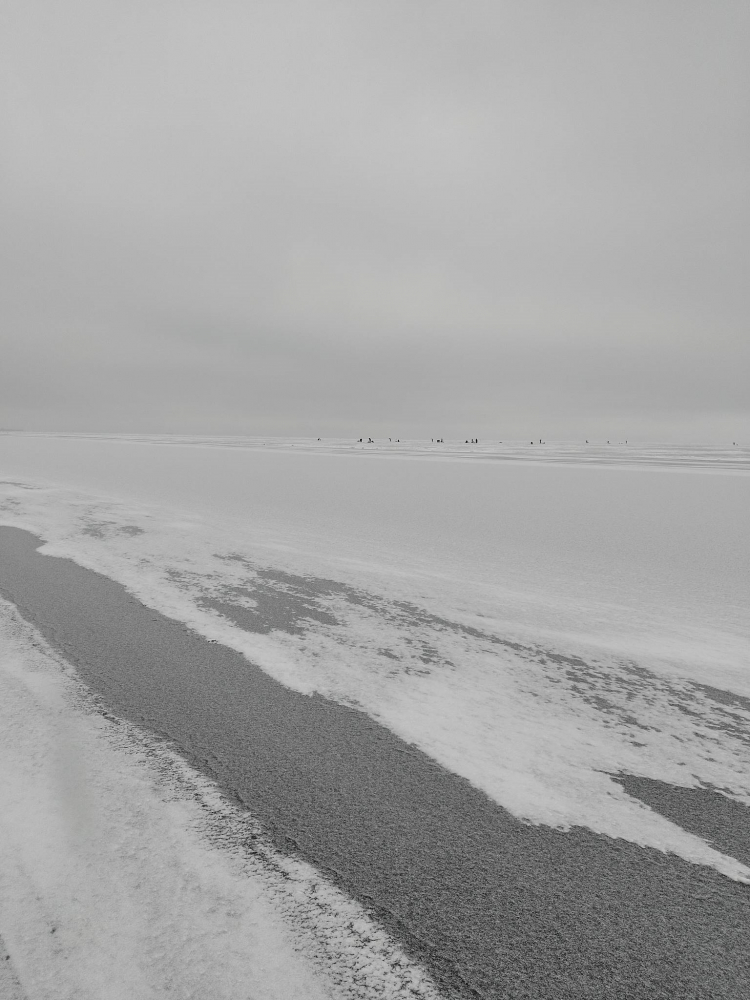 Заночевали у друзей и с утра ломанули с напарником на те же точки. И погода нас обломала капитально. К часу дня смотались, засыпаемые снегом и обдуваемые ветром. Поклевок правда видел шесть с утра до часу. Один сход. Серега (напарник) одну корюшку таки вымучил. Шли обратно, берега из-за метели не было видно, воспользовались накатанной дорогой от "подушки" и внезапно обратили внимание, что во-первых идем непропорционально долго, во-вторых снова стали появляться лунки, то есть получилось, что пошли вдоль берега и чуть в море. Пришлось кусочек дороги пройти контролируя перемещение по карте, пока не вышли точно на тропу идущую в сторону берега.