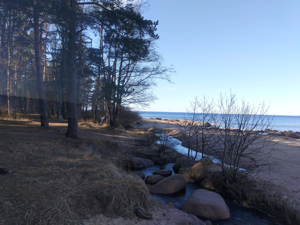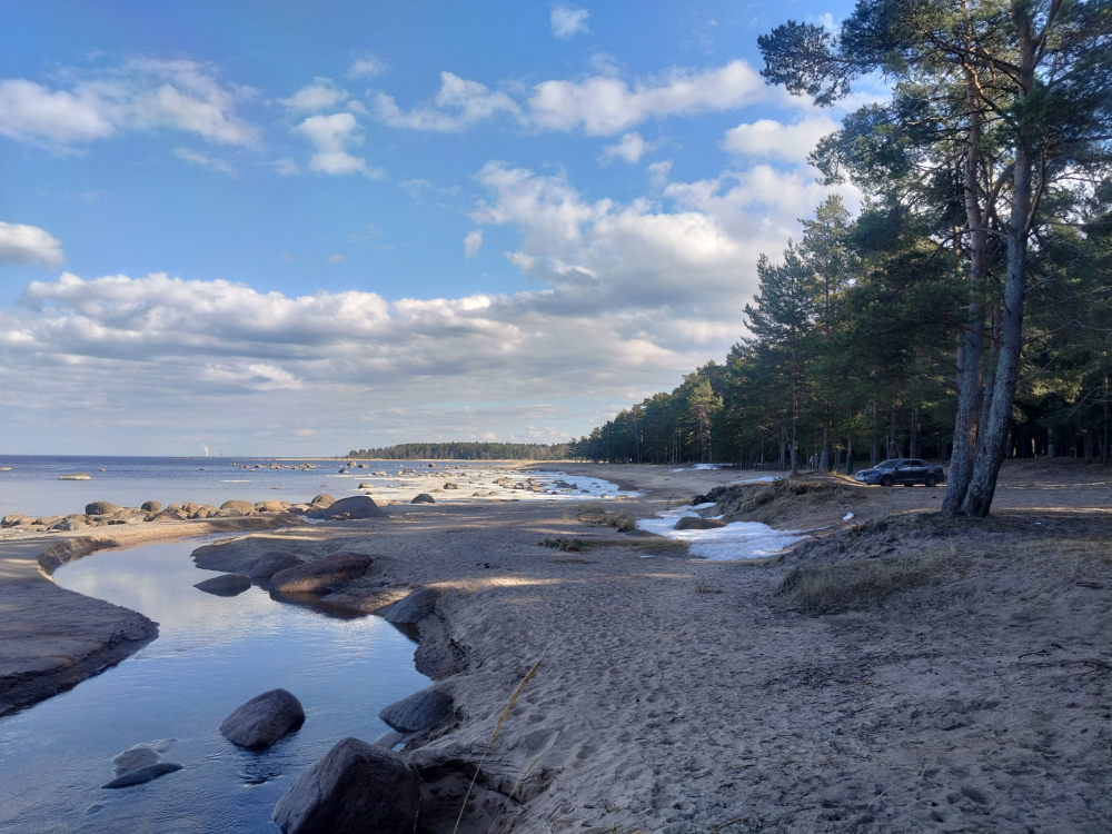 Протока ( где поокат лодок ) заморожена еще . Пляж : песочек .