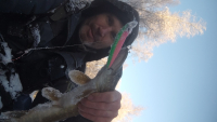 С утра, на пятой проводке, неожиданно клюнула щучка на 0,94 кг (см. фото). Далее на такую приманку соблазнились ещё только 2 окушка. Конечно, для окушков следовало бы поменять мормышку на более мелкую, серебристую или с подсветкой. Но ведь я «раскатал губу» и всё надеялся, что ещё одна щучка клюнет. Но нет. Однако и так не плохо: взял на деликатной оснастке бойкую щучку. Всем коллегам: НХНЧ!