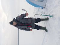 Испытал новый костюм поплавок - супер! В 16ч на стоянке, расспросил "собачатников": у кого 12, у кого 18 корюх. Короче " сосалово" у всех. Подышал кислородом, чай попил. Текухи и ветра нет - клëва тоже нет, давление упало.