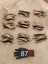 Сегодня. Погода-песня! 8.30.-парковка забита: и верхняя и нижняя стоянки. Напротив решётки метров 500. Наживка-филе карася из морозилки, ёрш с прошлой рыбалки и свежая корюшка. Равномерный клёв с 9.30. до 13.00. Поймал 66 корюшин (1.5 кг.) плюс 1 порезал. До 11.00. брала на карася, после 11.00. на ерша и корюшку, в основном на мелкие мормышки. В 14.00. свернулся и ушёл.