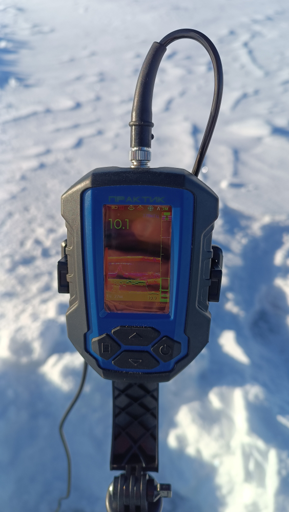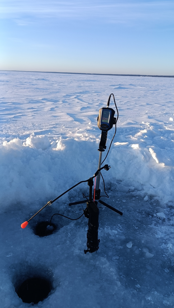 Прошлись по акватории (10минут), по светили эхолотом,... Рыбы не обнаружили, но глубину узнали. Встали на 18-19 метрах. С утра смог поставить только три удочки (одна из них блесна). Ветер- стульчик сдувает (пришлось привязать), пару раз бегал за рукавичкой. Какое там обновление наживки и засветка мормышек, Хотелось построить Великую Финскую стену.