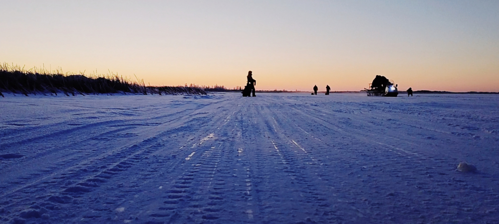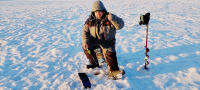 Потом приехали парни на мотосабаке. Спасибо им за общение и поднятое настроение. Клёв, один второй с одной лунки, с другой — и снова сверлить.