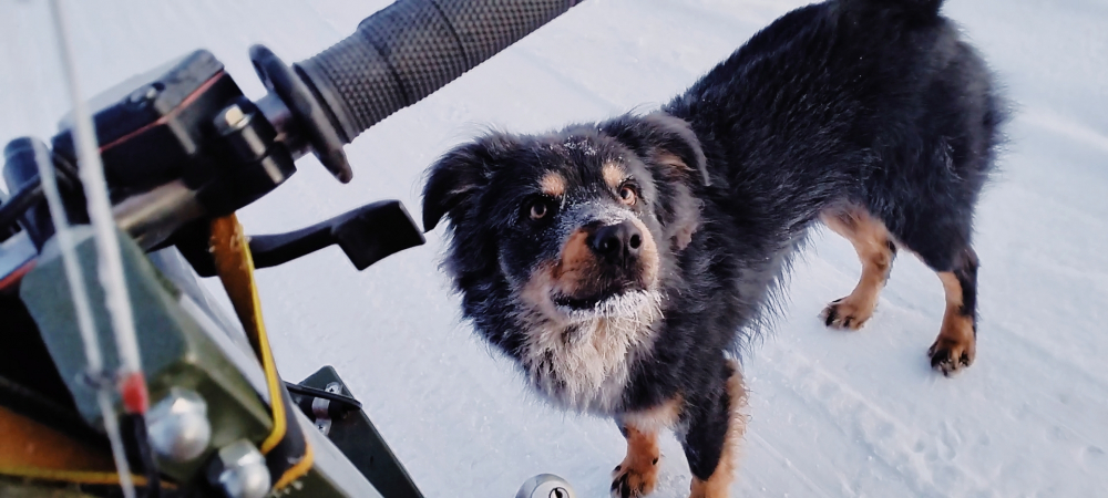 Сегодня, несмотря на мороз в -27 градусов, я решил проверить себя и снаряжение. Завел мотовездеход и отправился на Свирь. Мой верный пёс Хотошо увязался за мной. В Свирице мы зашли в магазин, чтобы согреться после холодной дороги. На реке был народ, но мы отправились на дальний кордон и оказались там одни.