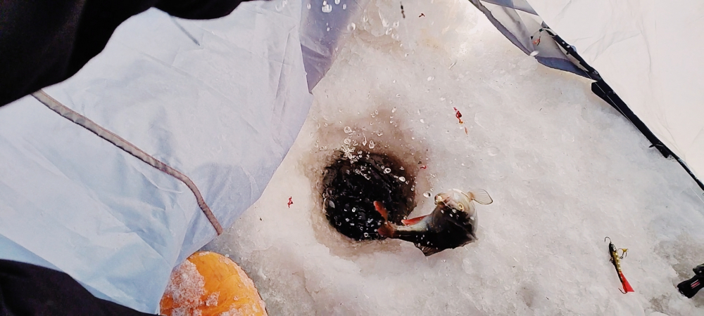 В такой мороз я экспериментировал с балансиром, пробовал разные варианты и блесны. Работала 7-ка Рапала. Пару лунок мне удалось раскачать. Но постепенно клёв сошёл на нет. Тогда я достал мормышки и залез в мобильную плащ-палатку. Подловил немного, но уже средне-мелкого.