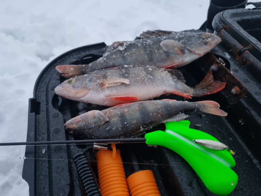 В три дня пошел к Большому Шурику в палатку, обрыбился парой окуней на мормышку.