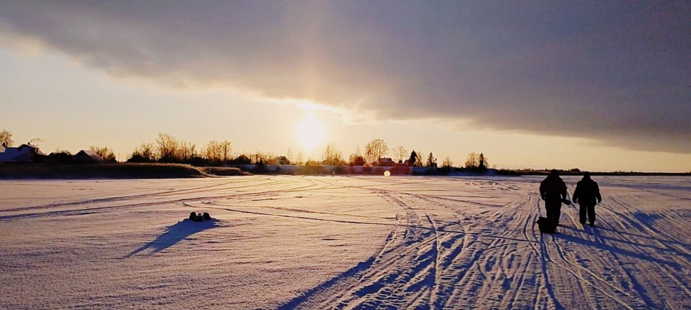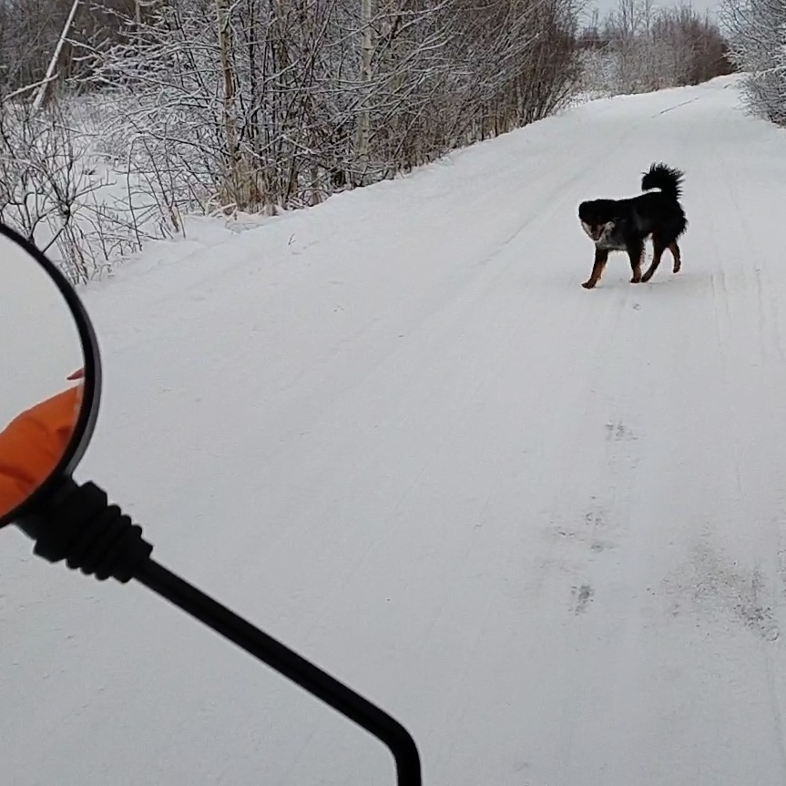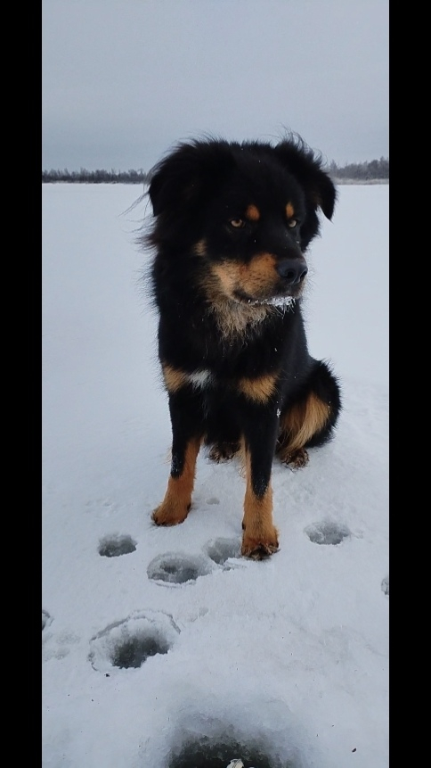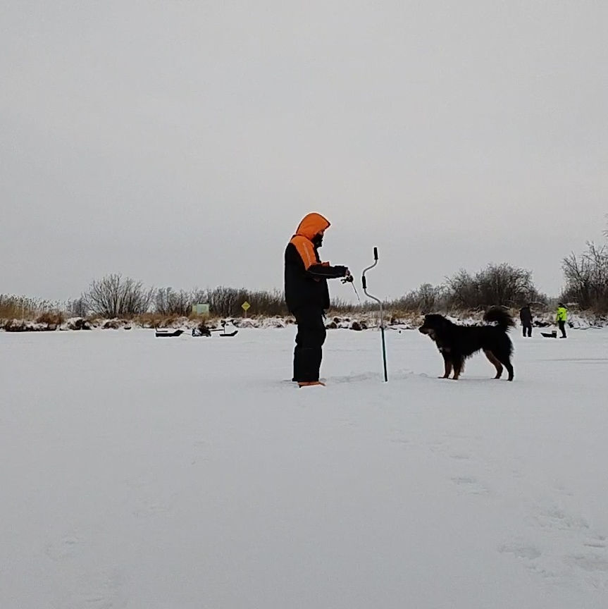 Остановился, расчехлился в надежде на вечерний выход. Приехали знакомые на «Мотособаке» и встали рядом. Мы разговорились, и я уже собрался уезжать, но тут Владимир вытащил достойного окуня. Потом он поймал ещё одного, и я решил остаться. Мы начали ловить хороших полосатых окуней, хоть и не активно. Рыбалка получилась трудовая, но замечательная. Пес счастливый гонял по реке, это был его день, облаял все снегоходы, аэролодки. Парни молодцы, они упорно ловили до вечера и в итоге добились своего — уехали с рыбой, чутка помог им окуньками.
