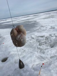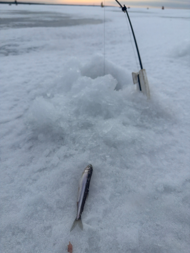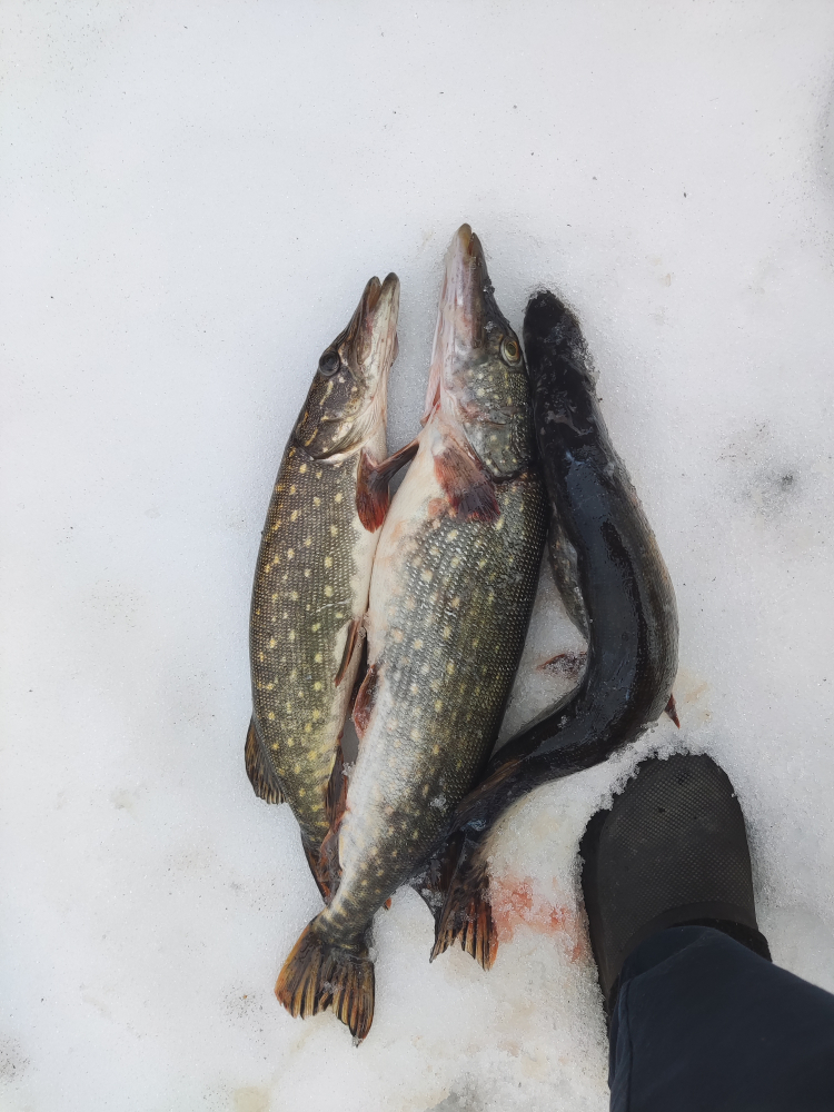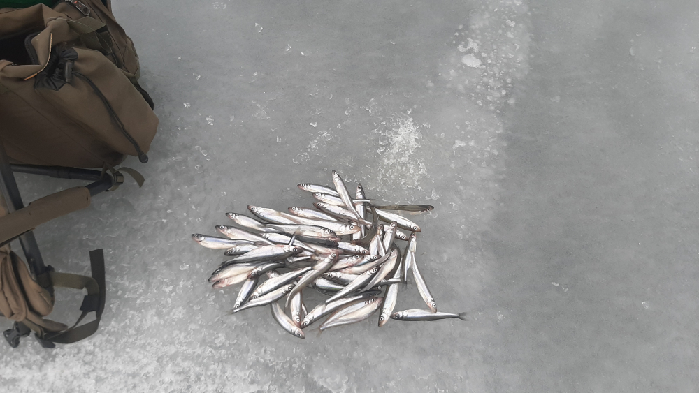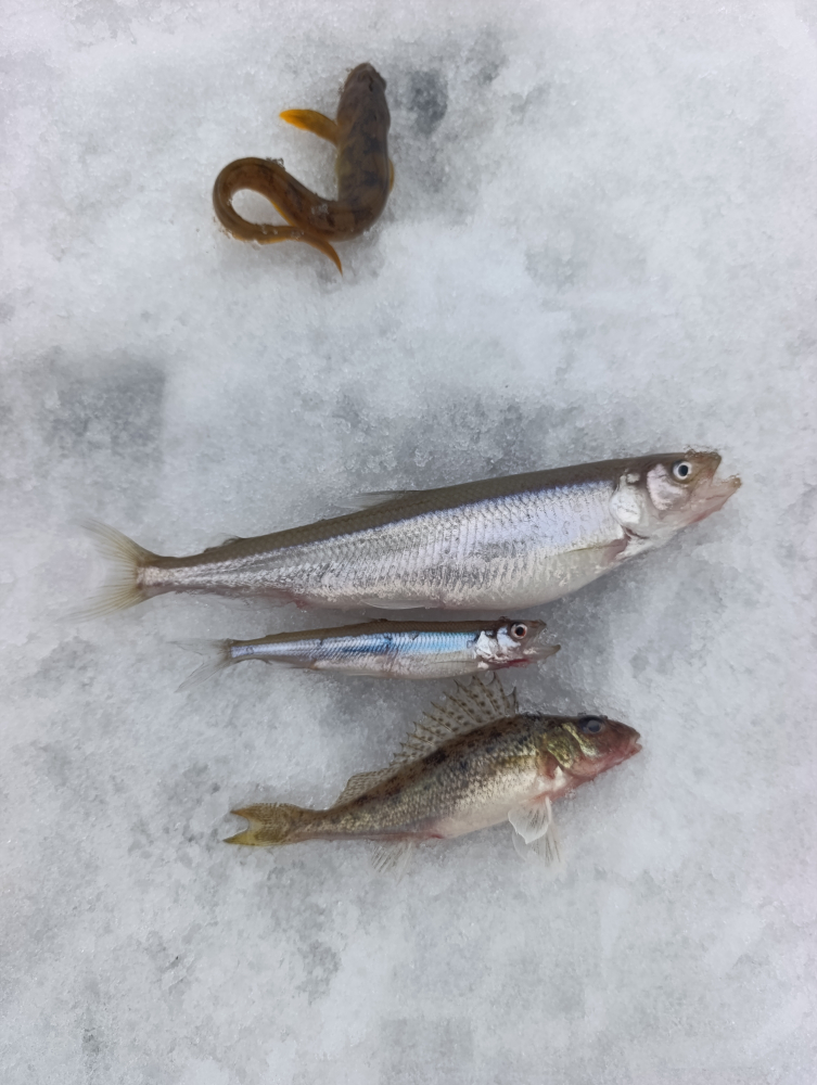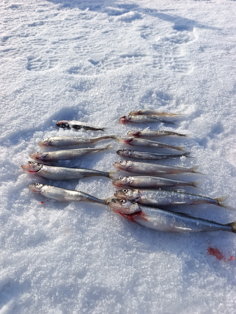 Вчера (07.03.2026) в Смолячково с 8:30-15:00. Туда утром идти нормально, наст частично подмерз, а обратно уже раскисло, но терпимо. Глубина 14м. Один дуплет и в прилове одна мелкая корюшка (была сразу порезана на наживку). Дуплет был хороший две мамки, как раз на сковородку хватило.