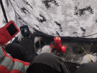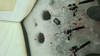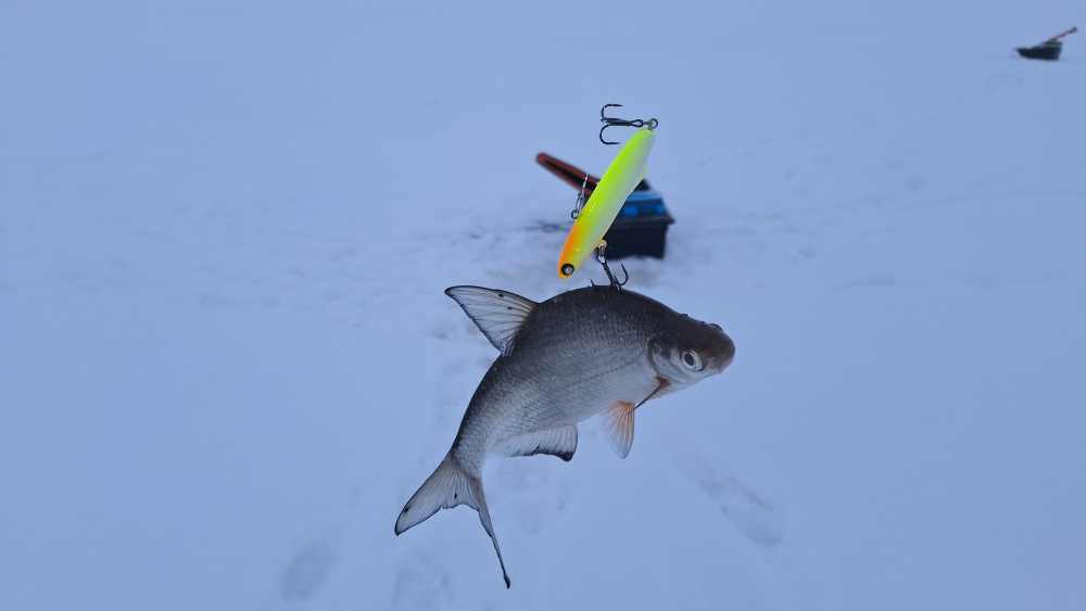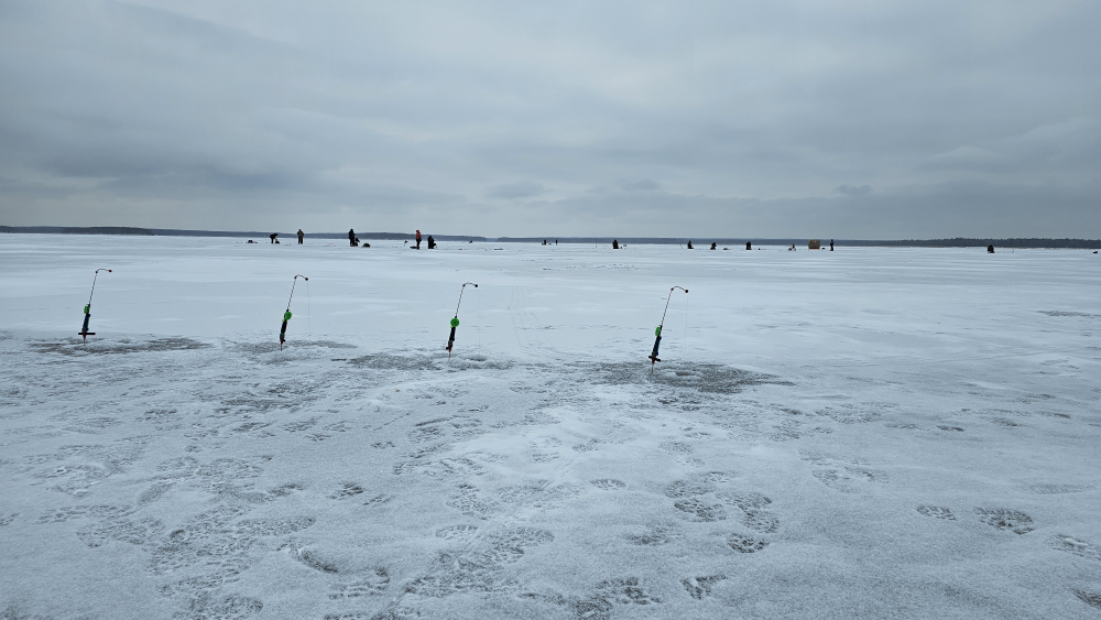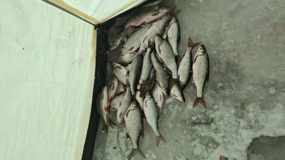 Я решил попробовать глубину шесть метров, где осенью хорошо ловил леща. С трудом пробурил лунку — ножам капец. Перекусил и заметил одну невнятную поклёвку. Решил вернуться домой, но по пути остановился на ямке, где рыбаки уже целый день ловили. Они рассказали, что за целый день улов не очень.