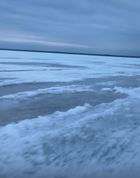 У берега трещина см30. Далее норм лёд, с км полтора, потом сдвинутые льды. Где мелкие льдины, где поля. Сморожено всё, 2-3 см льдом. Прошли на ура. Лёд асфальт.