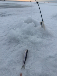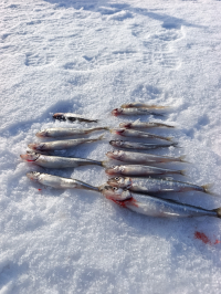 Были в субботу 7 марта. Снежная каша подморожена, идти хорошо и туда и обратно. Корюшка поклевывала весь день, но не подсечь, реализация 1:10. Мелочь, 22 шт. Карась. Стоял вначале на 14-16 м - ни поклевки, затем сдвинулся на 20 м. Народу - как на Невском первого мая.