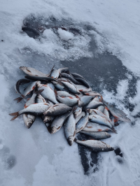 Приветствую всех коллег по увлечению, пишу первый раз. Сегодня с двумя дочками посетили порт Бронка. На льду были в 7.37. Первый облом двойной лёд, сдвинулись метров на 50, все хорошо. Сейчас думаем попрёт. Спустя каких-то 2.5ч первая шевеление кивка. Спустя 30 минут первый «огурчик», ещё через несколько минут подряд 2 шт. Далее до 13.00 один еле заметный прогиб кивка. Вокруг все сидели и скучали. Лёд хороший, больше 20 см. Перед установкой палатки проверяйте нету ли двойного льда. Всем удачной рыбалки!