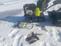 07.03. стоянка парк Дубки.. Два "Альбатроса" (длинный L8 и короткий М8 л/с).. L - чихает, у М - бенз. капает с карба.. Через 1час - всë починили. Умотали 5 км к Первомайске, глубина 9 м, на карася поклëвки были, не засечь, только 1 ëрш. В 13 свернулись поехали к форту, там 6,5м, мотыль с собой. Полосатый блесну не брал.. На мормышку уговорил 8 окуней (130-150 гр) - Калуша на уху!
