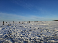07.03 - заходили от заставы, городищу немеряно. Проезжали мимо егеря там тоже народу много. Выходили в 8.30, к берега выдавило воду но пройти в сапогах можно. Много народу на технике, они объезжали ближе к мясу, там есть сухие места. Лёд как и был порядка 50см., воды сверху нет, всё подсушило, скользко, шипы обязательно. На расстоянии 1,2км. от берега живая трещина порядка 30см., с утра была затянута тонким ледком. Пошли к ближней куче, народ активно полавливал, забурились в стороне 17,2м., минут 30 и не поклёвки, пошли дальше, метров на 100, скраб от толпы, уже 19,3м. сразу начались поклёвки, тут и остались. С утра ветер ветерок дул в берег, днём солнышко, периодами ветер почти стихал. После 11 клевать почти перестало, много холостых и тычков. Почти вся рыба мелка, с пяток средней, и это из вечерних, крупной в этот раз нет ни одной. Танцы с бубнами не шибко помогали. После обеда народ кто не попал на рыбу начал активно блуждать в поиске рыбы, кто попал, те полавливали в течении всего дня с переменным успехом. Причём можно было сидеть рядом с тем кто ловил и чупсить. С 15 наро стал активно сваливать. После 16.30 задул резкий порывисты западный ветер, и все активно стали собираться к берегу. Проходивший мимо коллега по увлечению, сидел метрах в 100 от нас, сказал что взял 16 хвостов, у нас с малым вышло 32шт. В 17.30 выдвинуть к берегу. Дойдя до трещины увидели, что лёд раздвинуло и трещина уже стала порядка 1м. шириной и вода в ней как в бурной реке гналась ветром потоком. Так что в данной локации теперь не безопасно, можно у плыть, или хотя бы ждать севера, чтобы сдвинуло. То что писали про отрыв, это глубины за 20 с лишним м. В бинокль было видна вода, за ней снов ледяное поле. С учётом того что мы сидели на 19м, до того места не менее чем ещё с киллер или более.