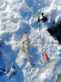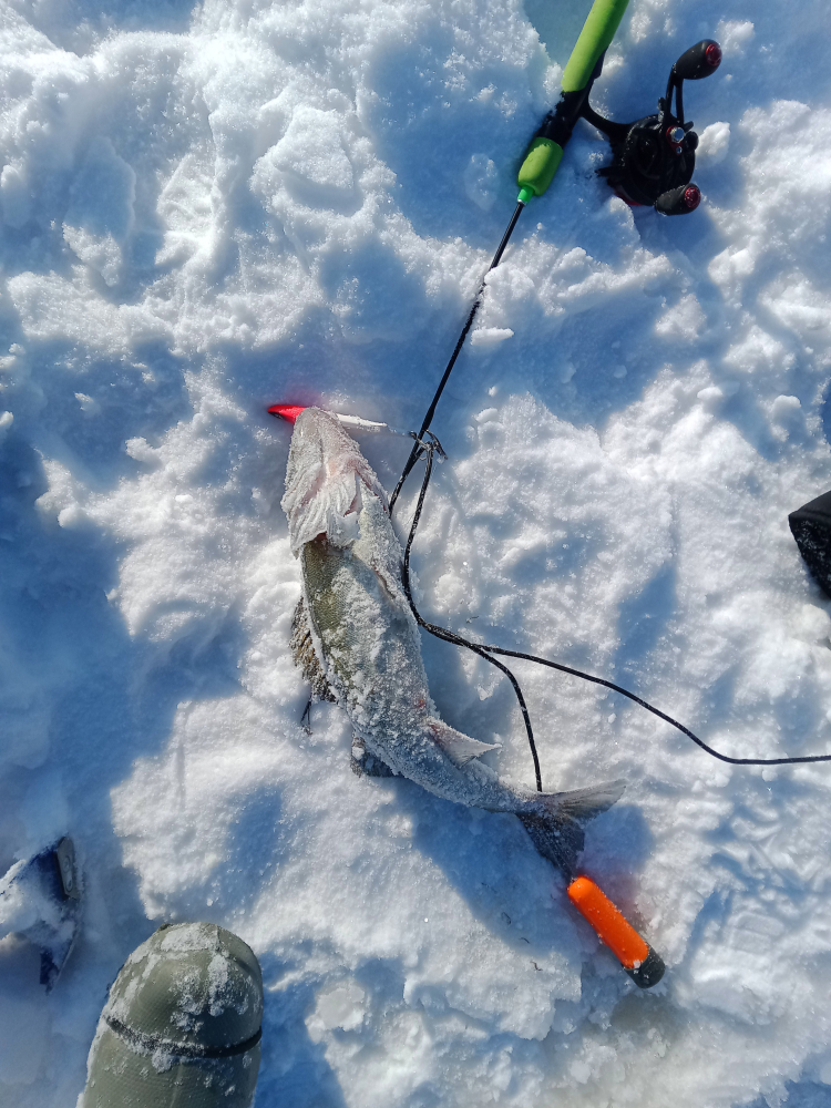 Кричу: “Мужики, рыба колом стоит, помогайте!”. Ребята бодро подскочили, рукой поправили рыбу в лунке, для надёжности прихватили за нижнюю губу липгриппом и не без труда, но выволокли судака на свежий воздух.