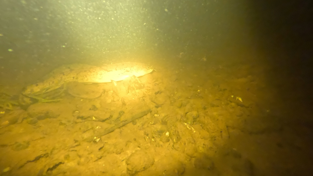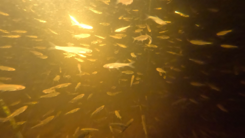 Просто плавал, любовался подводными красотами. Если сказать по другому, то есть по рыбацкому, получается чупсил. В основном у берега терся, глубины более 4 метра не обследовал, в прибрежной полосы много много мелкой рыбы ( членов стай не разбирал по видовому составу, наверное лосось) Возле толпы мальков в стороне налим крутился не большого размера и мелкая щука, а в пару мест заметил толпы плотвы прям кучей на дне лежала.
