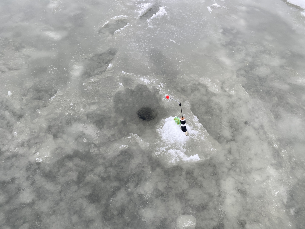 Решили поехать с товарищем на старые точки. В бухте Желтая были в 6-30, оттуда в море 3,5км. Пройдя 2,5км уперлись в черный лед, совсем без снега. Черный лед оказался толщиной от 10 до 3 см. Мы и еще парочку компаний развернулись и решили искать рыбу.