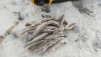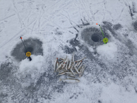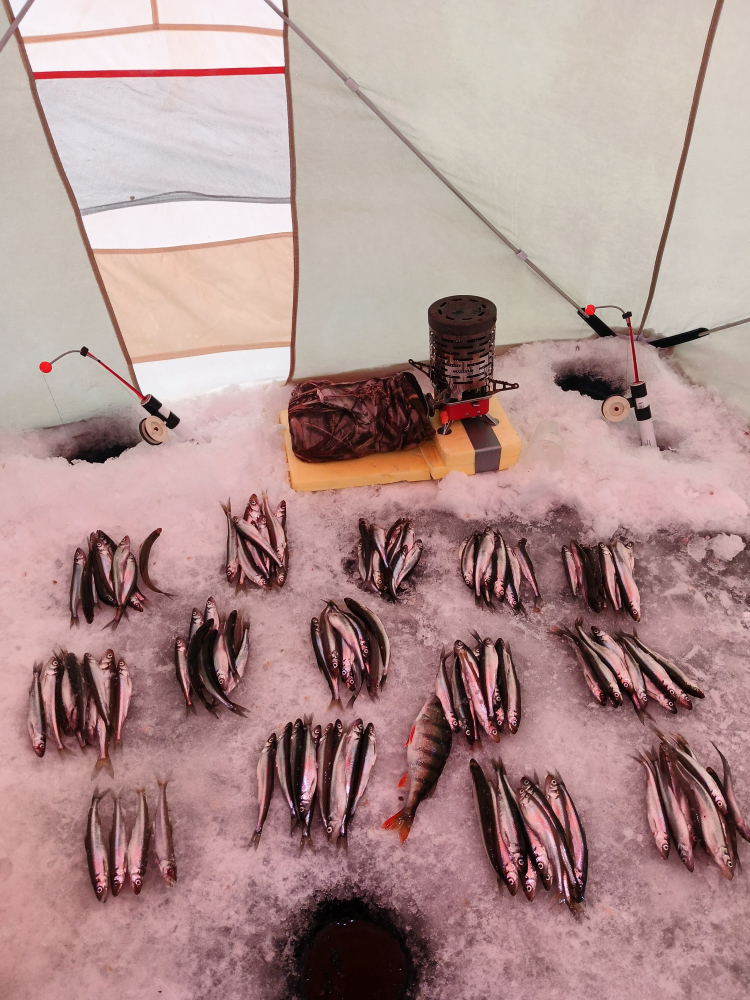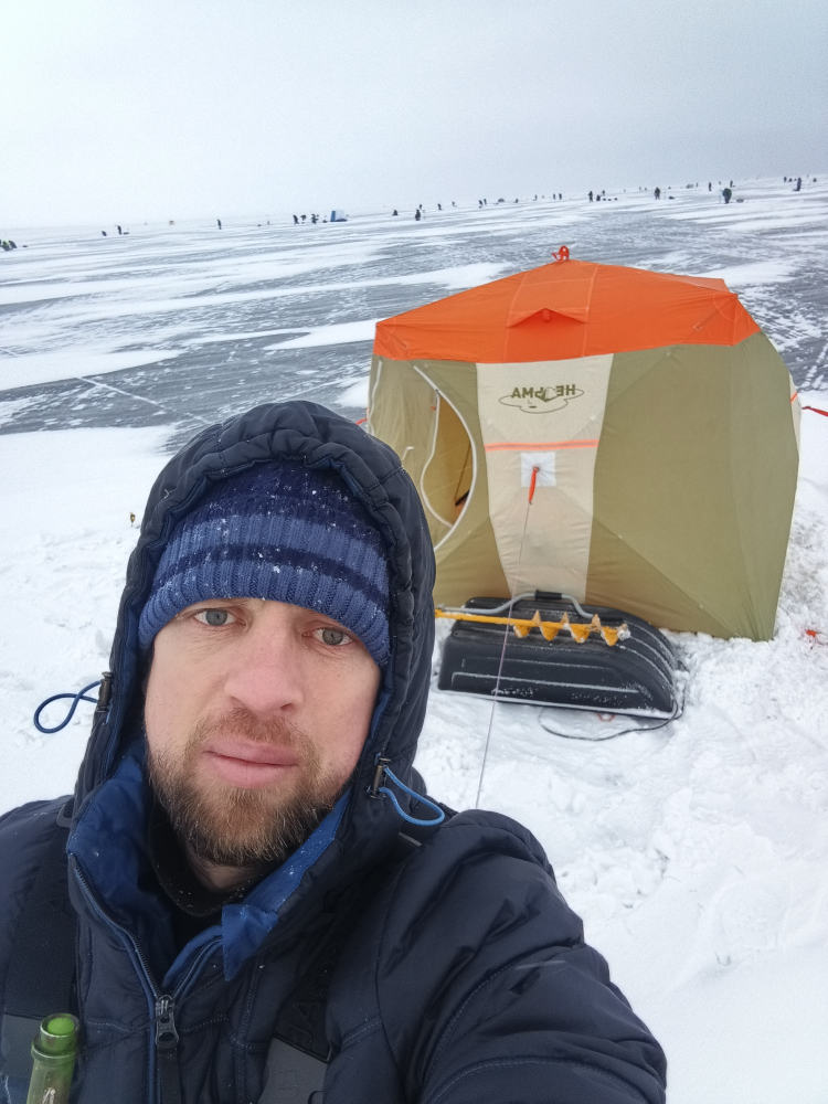 Сегодня с 7-40 до 11-30 поймал 3 огурца. Довольно сильный западный ветер гнал поземку, ловить было совсем не комфортно.Кто сегодня был в палатке не прогадали.