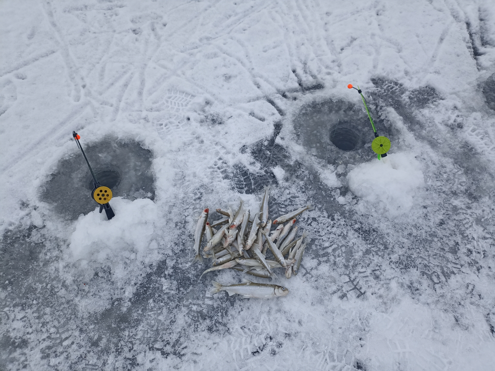 Решил открыть корюшиный сезон.С напарником были на дамбе 7 часов,места еще были.Ловили напротив перехода ,30минут хода,глубина около 10метров.Первая поклевка в 8,30.Потом вяло текущие поклевки до 14,00.Итог,на двоих,31 штука мелкой корюшки.