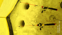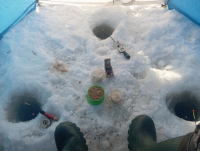 был с другом Лëшей 7го. Стоянка у парка Дубки. С рассвета мороз -20. Встретил там давнишних друзей, они на мощной собаке на корюху вдаль. Ходьбы 2+ км, сели на свале 5 м. Чупс! палаточники в округе ходили др. к другу в гости, интересовались.. Солнце яркое, мороз, ветра нет, течения тоже нет. Прикорм, мотыль, опарышь, червь, тесто - пофиг..