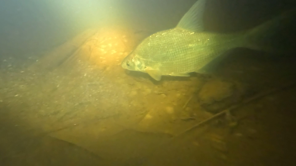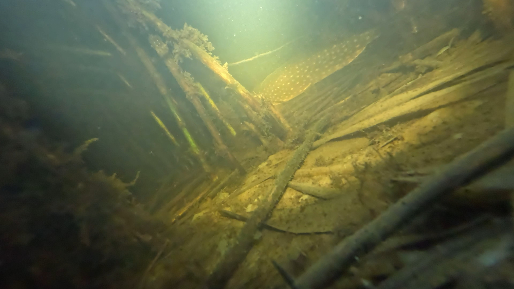 В протоках немногочисленное стадо рыбы в виде подлещика и окуней ходят туда сюда. В тростнике мелкая щука стоит в оцепеней в ожидания нереста. На дне валяются жерлицы, видать кто-то выставил а снимать уже не смог, три штуки я поднял и положил на тростнике вдруг хозяин на лодке решится собирать свой комплект.