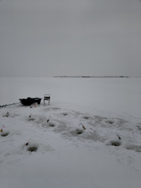 Лисий нос. Рыбачил на 5 метрах, с 14-18. Клёв был пока была слабая текуха в сторону города, плотвичка хорошая, по 300гр. 2 десятка надёргал. Колюшки не было, ловил на мотыля. Днём только на игру, вечером брала со дна. Народу почему то мало, хотя лёд хороший, от 15 до 30см.