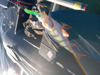 Сегодня, вышел в 11 утра, троллинг и отводной поводок.. надоела плотва (потом лодку от прикорма протирать надо).. В берегу полосатого нет.. начиная с 4-4,5 м он есть, но стай окуня не нашёл.. в основном одиночки..