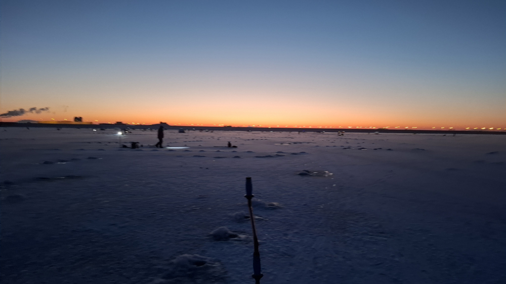 Приехали в 7:20, места на нижней парковке ещё были. Поднялись у решетки- красота, палаточный город и везде фонарики))). Встали на старом фарватере, глубина 11м. Карася нынче не достать , взял у напарника кусок леща. Первая кровь в 8:45, с 9 до 11 немного поклевала, а потом все хуже и хуже. Прикол! В 11 подошёл мужик, сидел сзади меня. Ни поклевки у него, попросил "взаймы" корюшину. В итоге он часа в 2 дня смотался и ушел по-английски))) То ли так и не поймал, то ли забыл про "взаймы".