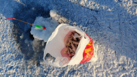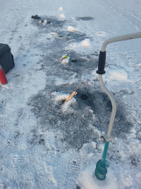 В итоге в 17 свернулся. Вечернего клёва так и не было. Улов 65 штук. На фото самая уловистая мормышка сегодня. 90% улова на снасть с блесной вместо груза. Классические кобылки молчали весь день. В прилове бычок и ёрш( его почикал, но толку не было)